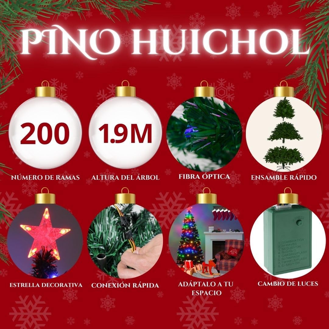 RACK & PACK Arbol Navidad Artificial Fibra Optica Frondoso Altura 180 Cm Arbolito Navideño Verde 200 Ramas Luces LED Pino Premium Moderno Luz de Colores Base de Acero Decoracion Navideña para el Hogar
