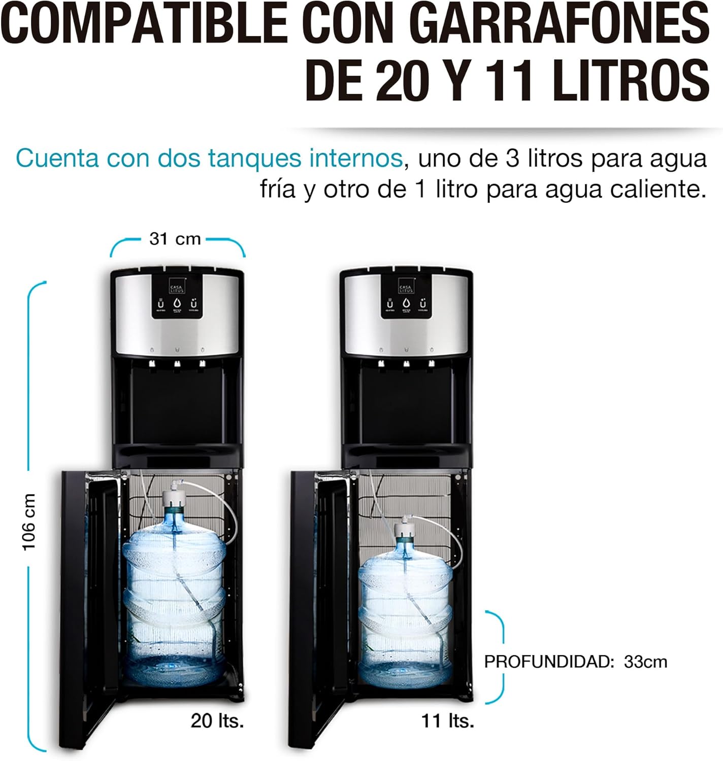 • COMPATIBLE CON GARRAFONES DE 11 Y 20 LITROS: Aprovecha el espacioso cajón inferior para instalar garrafones de 11 y 20 litros, asegurando que los tanques de agua fría y caliente siempre estén llenos. Conecta la manguera al garrafón y disfruta de una solución eficiente y sin complicaciones para mantener el suministro de agua