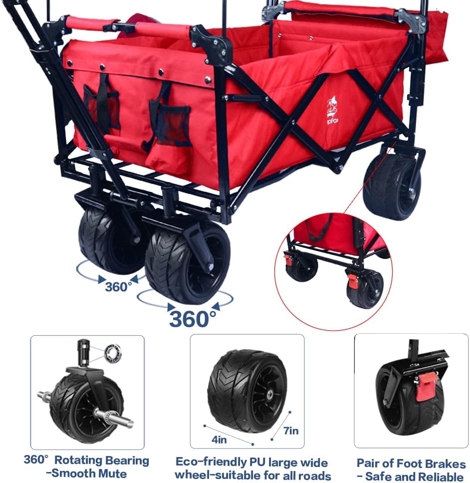 • Características funcionales: 360 ruedas grandes giratorias (lado: 7 pulgadas de diámetro x 4 pulgadas de ancho) se pueden utilizar ampliamente en arena de playa, rampas, piedras, césped, escalones, etc. Asas ajustables empujar y tirar. Un par de frenos de pie en las ruedas traseras. El mango de tracción con bloqueo fijo se puede extender hasta 40.75 pulgadas.