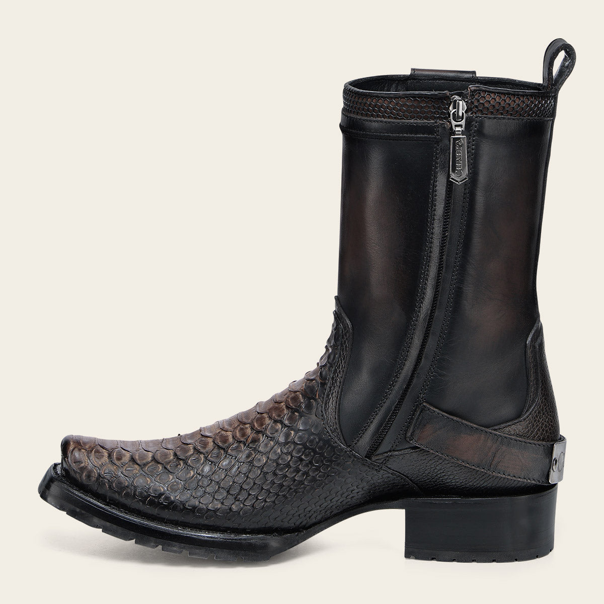 Bota urbana para caballero en piel genuina de pitón y piel de bovino. Presenta aplicaciones de KPU, aplicación metálica con el logtipo Cuadra, correa decorativa con aplicación metálica ajustada con hebilla. Jaladera de piel en la parte trasera. Ajustada con cierre interno. Cuenta con las nuevas tecnologías: planta Ortholite, plantilla flex removible. Con suela de hule antiderrapante.