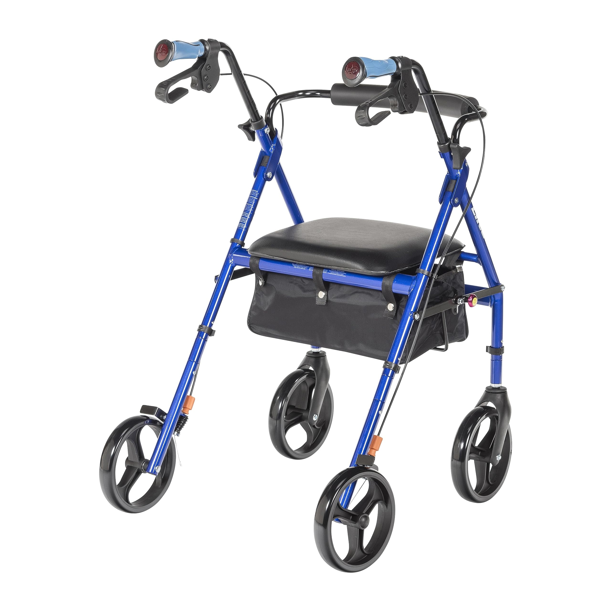 - Andador con ruedas y asiento: Este andador de élite, elegante y moderno, viene con un marco liviano y una espaciosa canasta de almacenamiento debajo del asiento para mayor privacidad y seguridad.