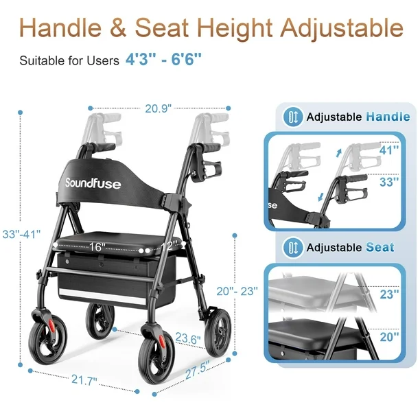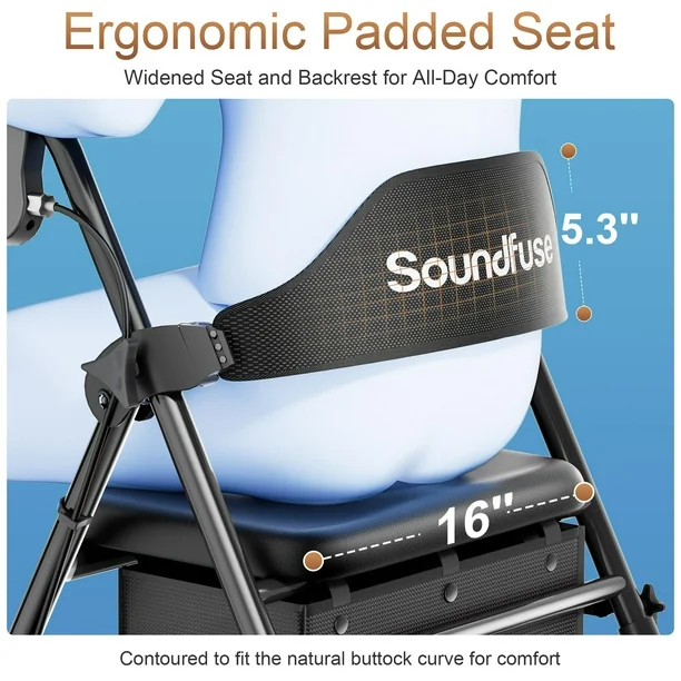- Estable y duradero: Con un marco triangular reforzado y soporte de doble travesaño, el andador con ruedas Soundfuse con asiento soporta hasta 159 kg. Sus tubos engrosados garantizan mayor resistencia y durabilidad, garantizando estabilidad en cada paso.