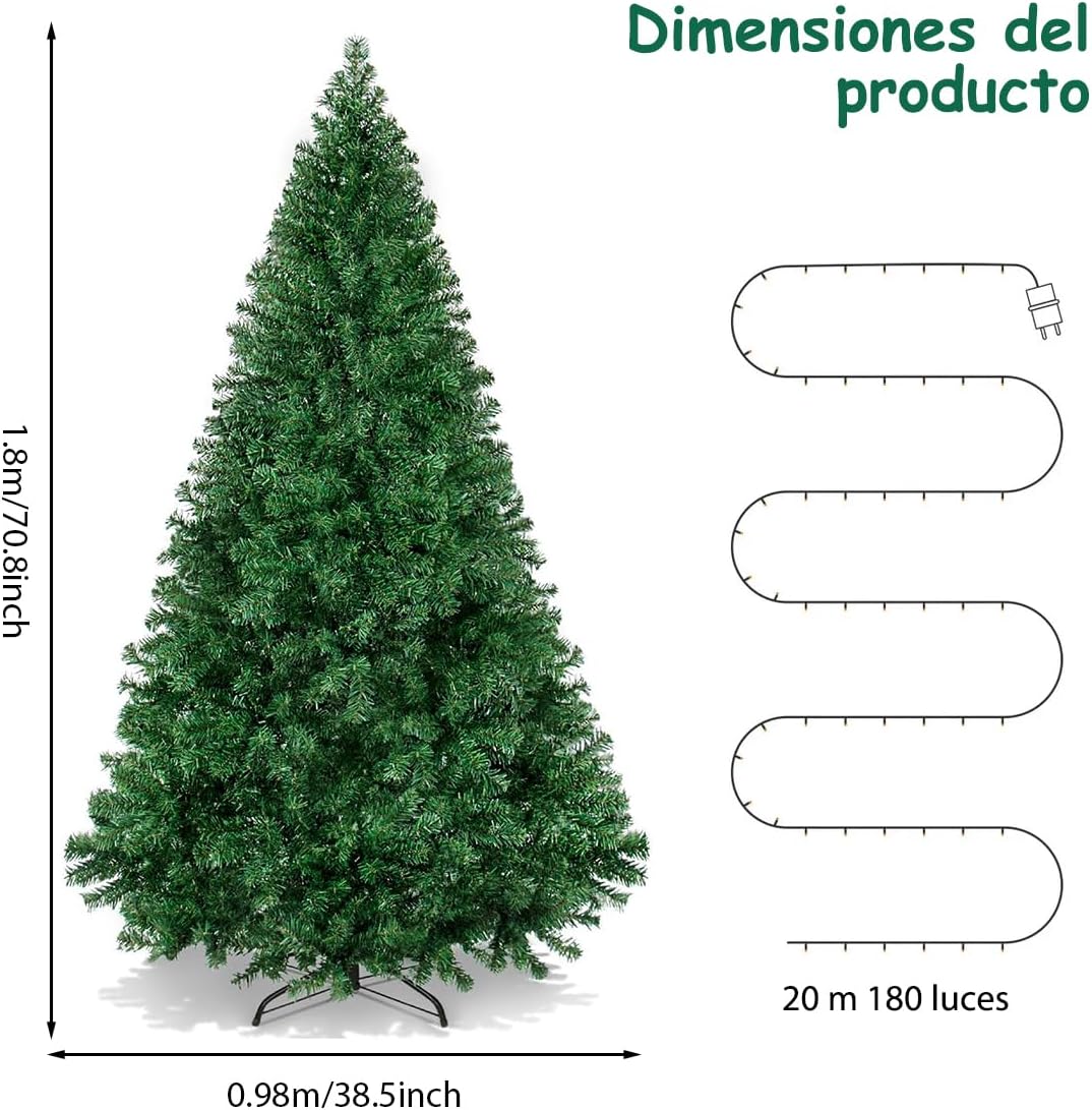Árbol de Navidad Artificial Premium de 1.8M con Luces LED Integradas, Base de Metal Cruzada Estable, Fácil Montaje para Decoración Navideña en Interiores y Exteriores