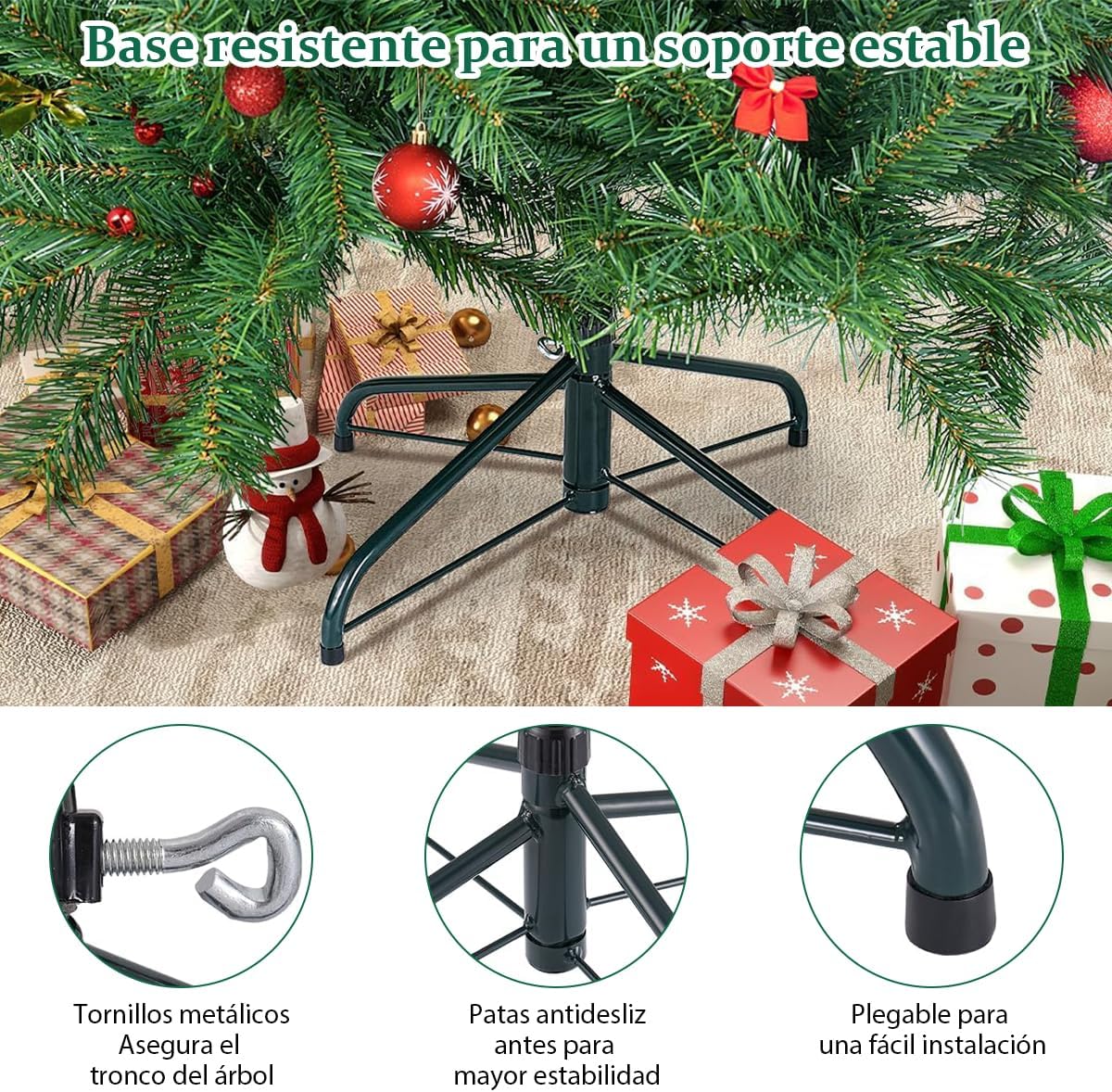 • Base de Metal Estable y Segura: Construida para la estabilidad y la seguridad, el árbol está soportado por un duradero pie de metal en forma de cruz. La base cuenta con almohadillas antideslizantes para evitar rayar tus pisos y garantizar que el árbol permanezca erguido y seguro, incluso con mascotas activas y niños emocionados, dándote total tranquilidad