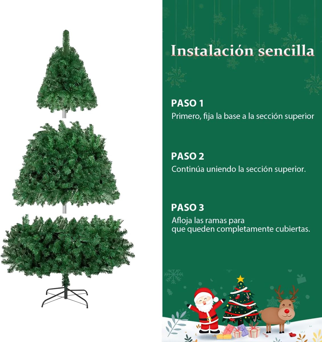 • Montaje Fácil y Rápido: ¡Disfruta de más tiempo decorando y menos tiempo montando! El árbol está diseñado inteligentemente con una construcción de ramas con bisagras y un sencillo sistema de secciones entrelazadas. Simplemente conecta las secciones al poste central, extiende las ramas y tu hermoso árbol estará listo en minutos. El desmontaje para almacenarlo es igual de sencillo