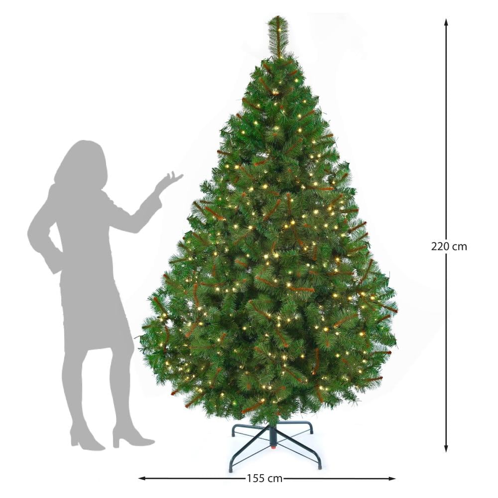 LUJOSO Y MODERNO. Árbol de navidad de 220 cm de altura. Simula un aspecto natural dándole ese toque navideño a tu hogar. Cuenta con 1104 puntas para distribuir, peinar y organizar a tu propio gusto, de esta manera, lograras un árbol voluminoso y moderno.$$LUCES LED. El pino de navidad integra luces led de luz cálida incorporadas en todas sus ramas para resplandecer aún más el pino, por lo que te podrás ahorrar la compra de series navideñas extras. Cuenta con conexión de entrada de 120V 60Hz 0.20A y una salida de 30 Vcc 0.24A.$$PATAS DE ACERO. El arbolito de navidad cuenta con patas de acero con 4 puntos de anclaje para una máxima estabilidad. Su estructura del pino permite colocarle adornos navideños (no incluidos) por todas las puntas del árbol navideño.