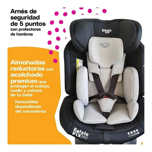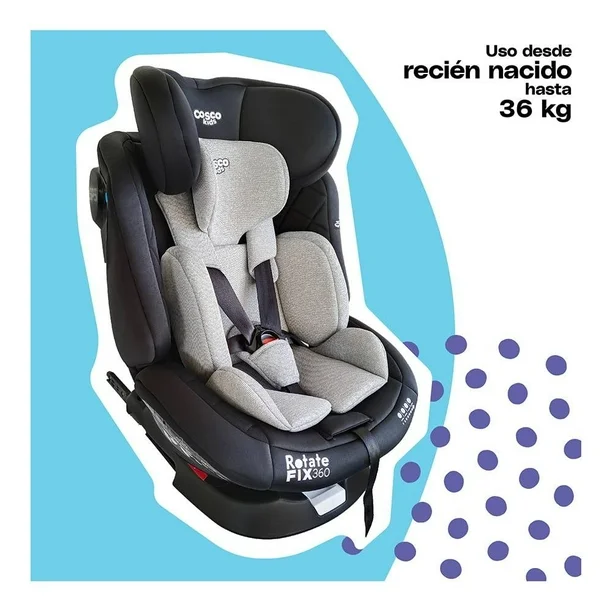 ¡La mejor forma de salir de paseo con tu bebé es con el autoasiento Rotate Fix 360 de Cosco Kds! Será perfecto para que tu bebé lo use desde recién nacido hasta los 36 kg. sin que tengas que cambiar de autoasiento. Su innovador sistema de giro 360° te encantará, pues podrás colocar y retirar a tu bebé con total comodidad y facilidad, lo que hará tu vida más sencilla. Es un autoasiento muy seguro, ya que cuenta con sistema de protección de alto impacto Side Protection System (SPS) y un arnés de seguridad de 5 puntos con protectores de hombros que te dará total tranquilidad y confianza. Sus almohadas reductoras con acolchado premium ayudan a proteger el cuerpo, cuello y cabeza de tu bebé, y son removibles conforme va creciendo tu pequeño. Es muy versátil al poder ajustar el reposacabezas en múltiples posiciones y las 4 posiciones de reclinación (una a contramarcha y tres a favor de la marcha), adaptándose a las necesidades de tu bebé en cada etapa. No tendrás que preocuparte por su instalación ya que es sencilla y segura gracias al sistema ISOFIX y Top Tether, pero también podrás optar por instalarlo mediante el cinturón de seguridad. Además, sus telas son confortables, retardantes al fuego y anti-hongos, y son muy fáciles de mantener limpias pues son removibles y lavables a máquina, garantizando que tu bebé esté bien en todo momento. ¡Viajes cómodos, fáciles y seguros con su autoasiento Rotate Fix 360 de Cosco Kids!
