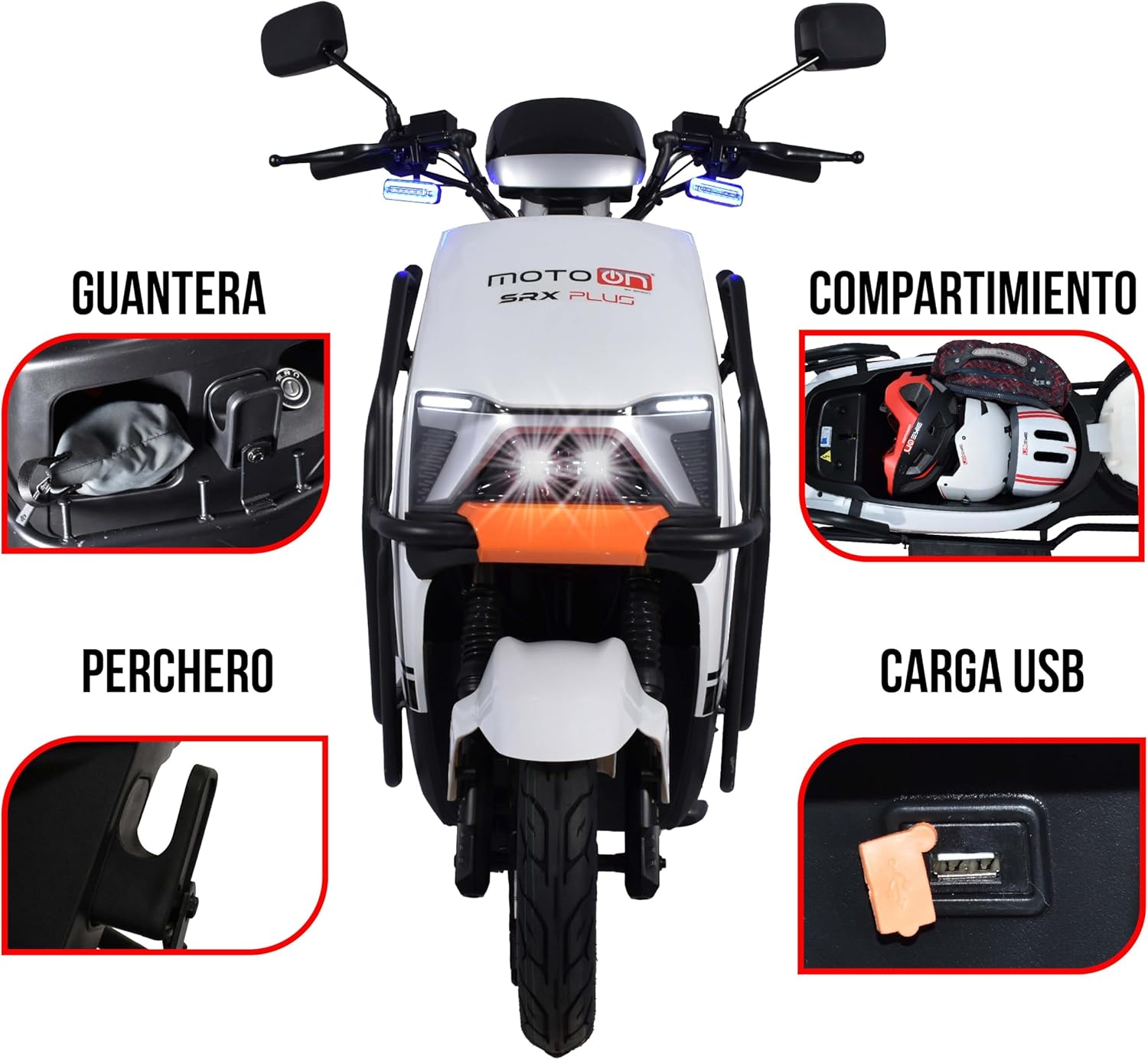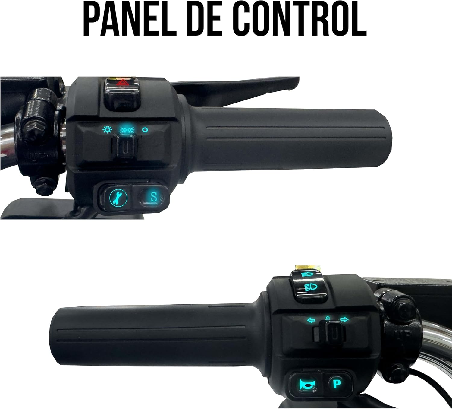 - Equipamiento completo con pantalla digital, luces LED y puerto USB, Incluye retrovisores, guantera, gancho y suspensión doble, ideal como motoneta eléctrica o scooter funcional para adultos urbanos.