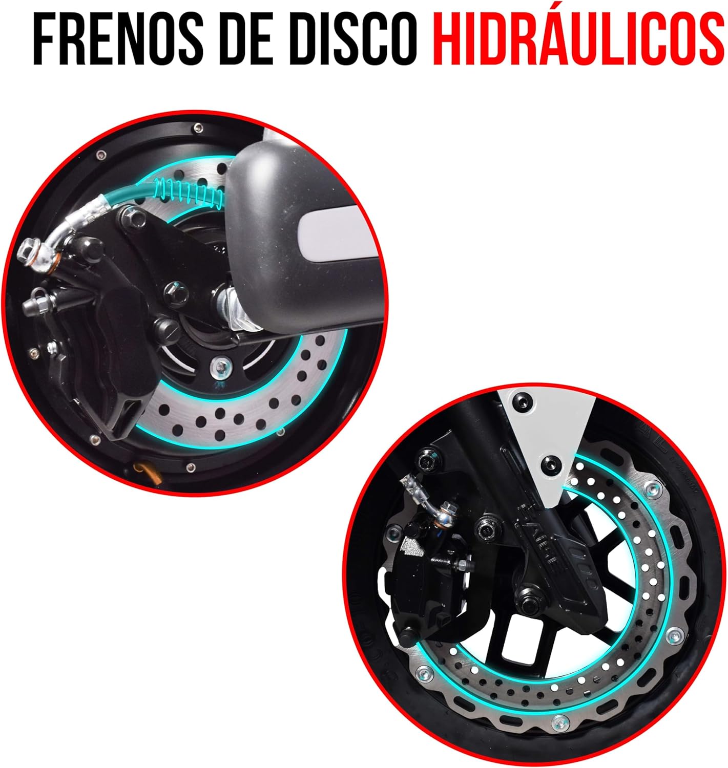 - Frenos de disco hidráulico y llantas tubeless 3.00‑10 para mayor estabilidad, garantizan control en condiciones urbanas o terrenos difíciles, brindando seguridad como motoneta eléctrica o bicimoto urbana