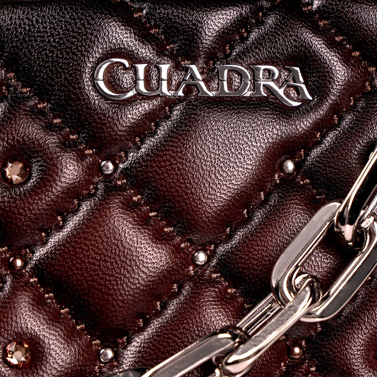 Crossbody para dama en piel genuina de bovino. Diseño capitonado con estoperoles, cristales auténticos, cadena metálica decorativa al frente y aplicación metálica de logotipo Cuadra. Cuenta con tres compartimentos en su interior. Asa larga ajustable y desmontable de textil. Asegurada con cierre.