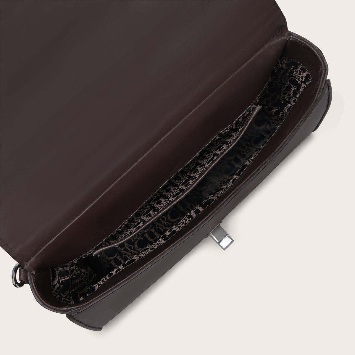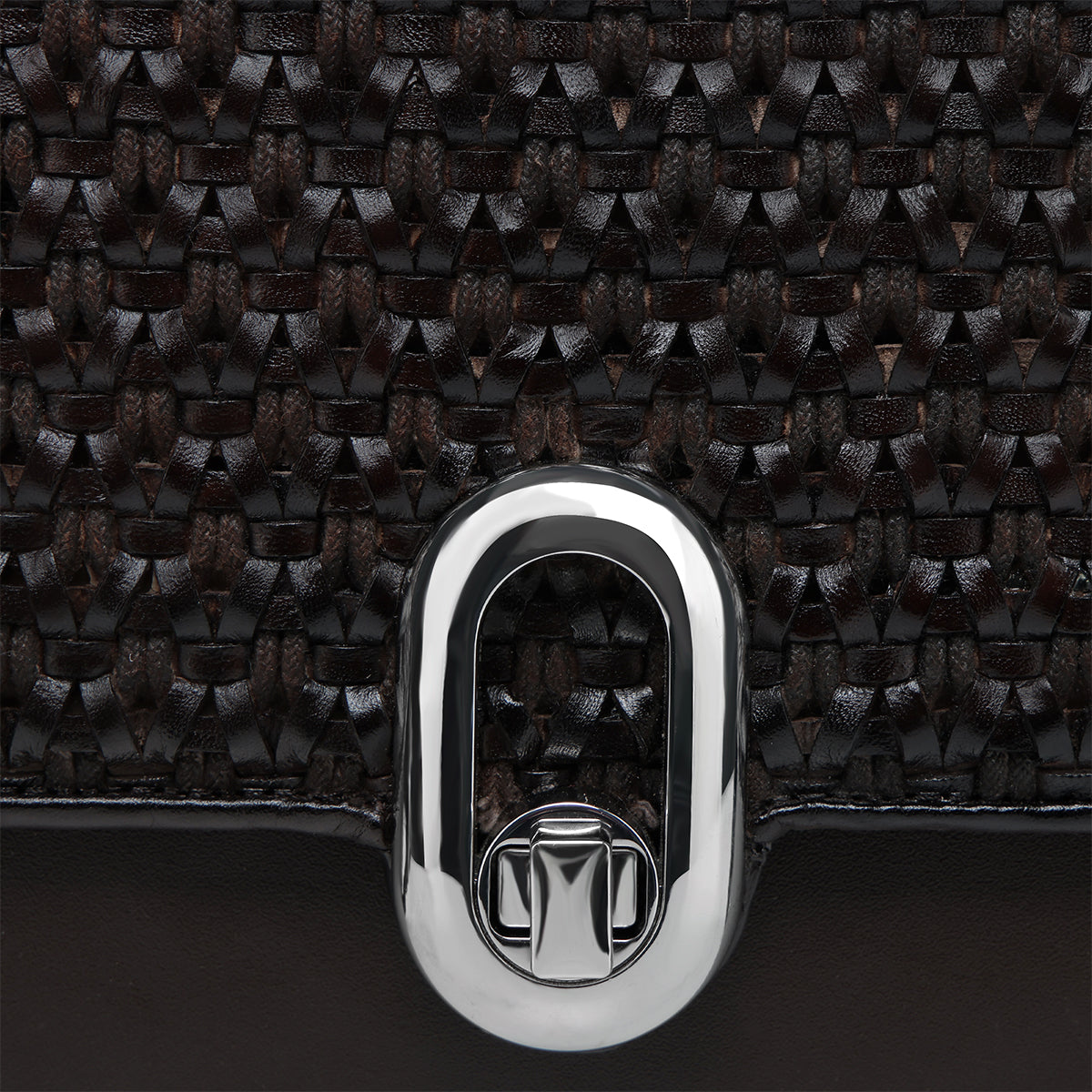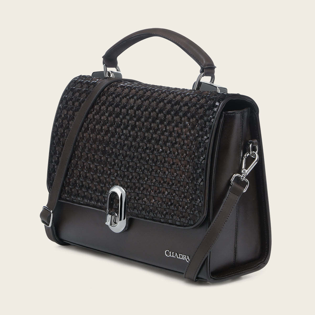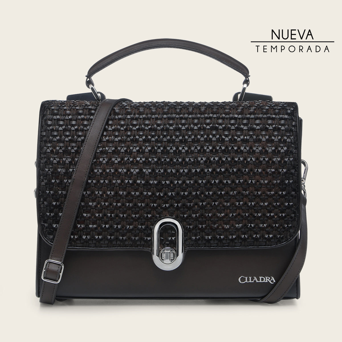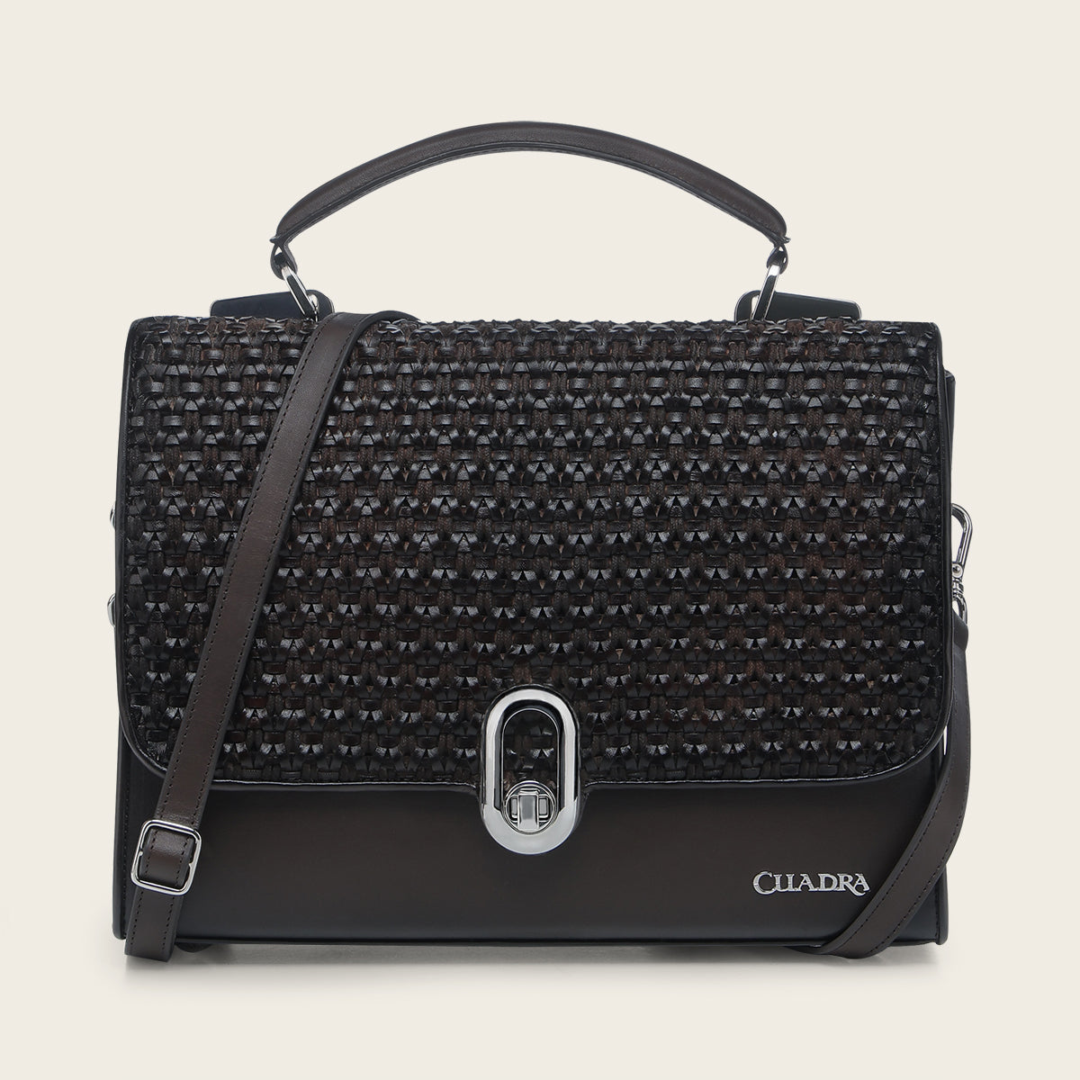 Bolso de mano para dama en piel genuina de bovino. Con tapa entretejida de manera artesanal y aplicación de logotipo Cuadra al frente. En su interior cuenta con un compartimento. En la parte trasera cuenta con un bolsillo que cierra con broche. Con asa corta sujeta por aplicaciones metálicas y asa larga desmontable y ajustable. Asegurada con broche metálico.