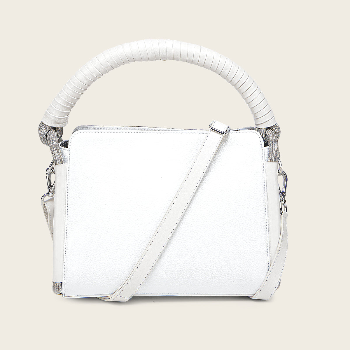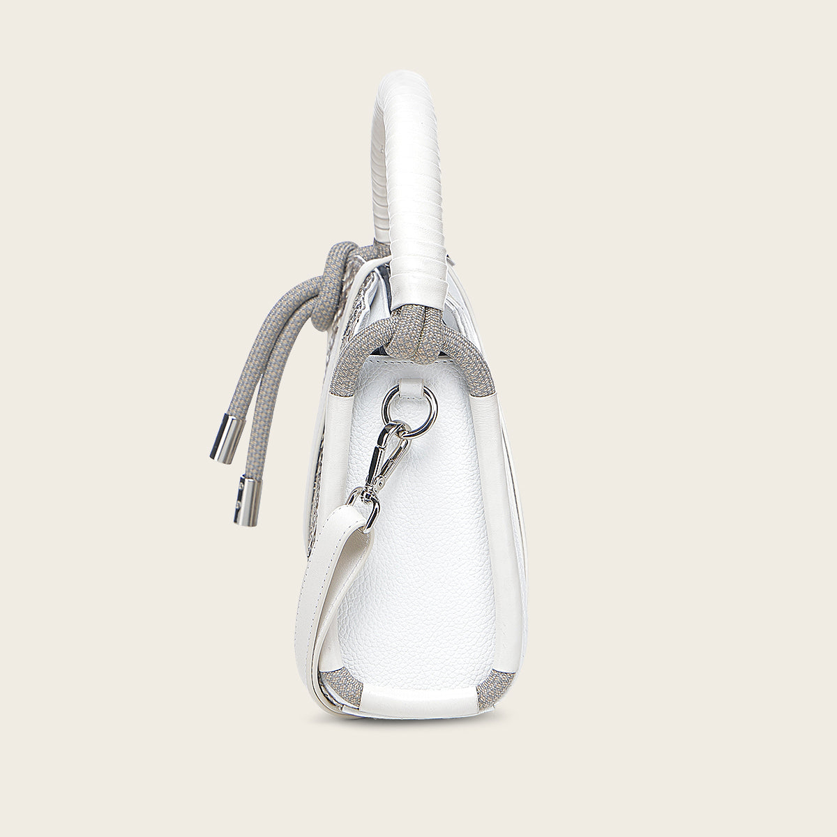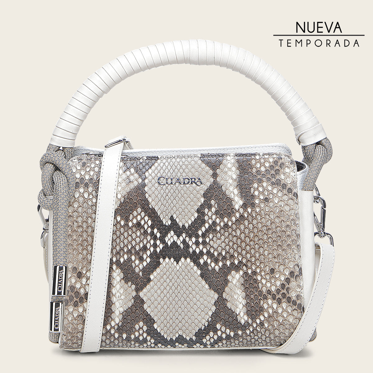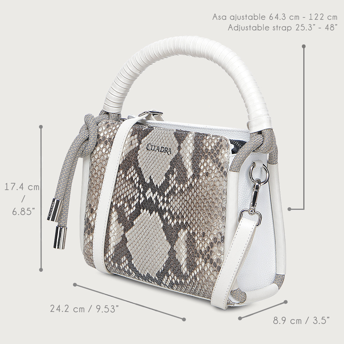 Crossbody para dama en piel genuina de pitón y piel de bovino. Presenta tres compartimentos internos, uno asegurado con cierre. Con asa larga ajustable y desmontable y asa corta forrada en piel de bovino, de la cual cuelga una aplicación de cuerda. Asegurada con cierre.