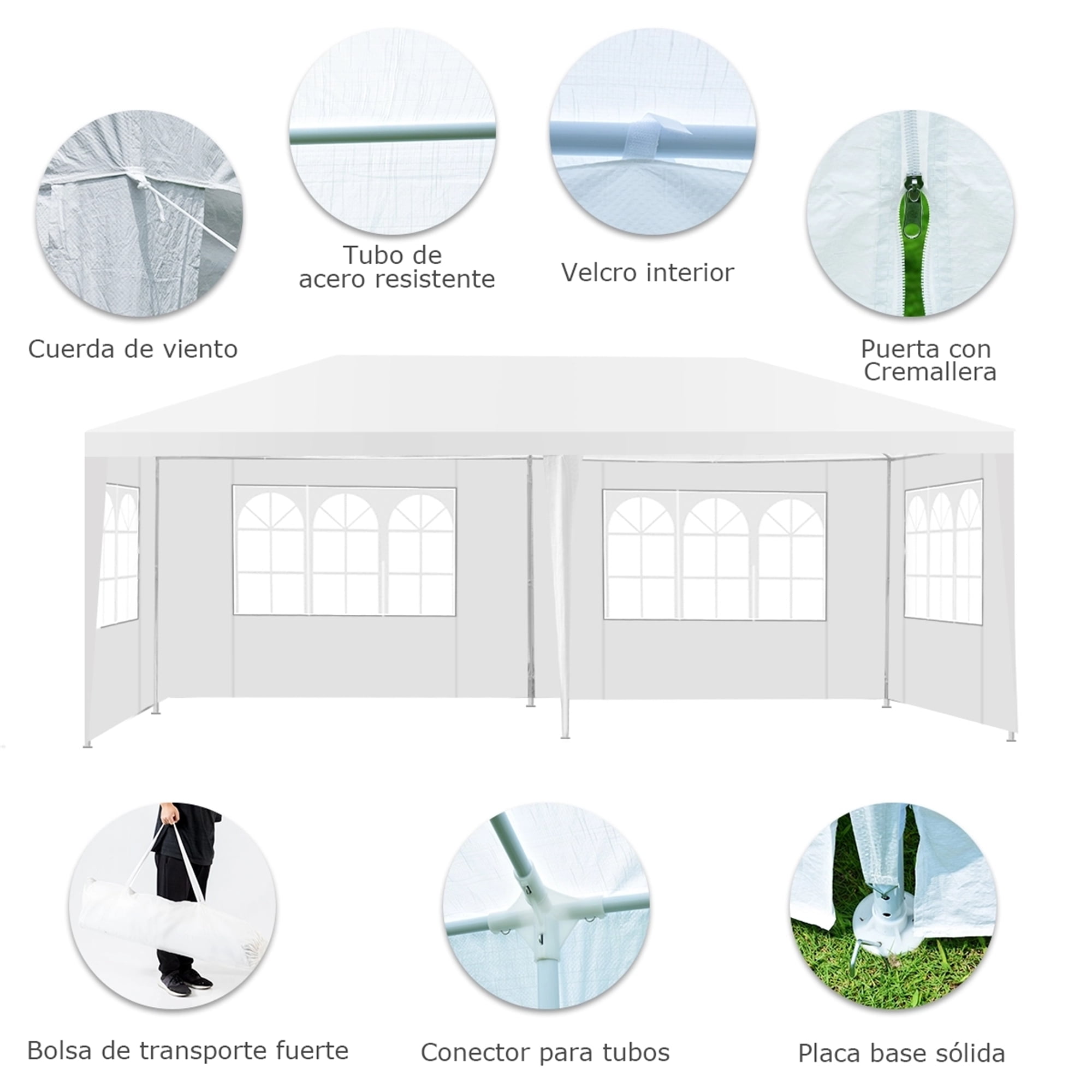 Estructura en acero duradero y sólidos conectores de plástico|| Tejido PE de alta calidad con excelente resistente a la intemperie|| Amplio espacio y gran sombra para que quepan 10-12 personas|| 4 paredes removibles según necesidad|| Cuerdas y palos incluidos para añadir estabilidad|| Ventanas transparentes que permiten ver en el exterior|| Perfecto para ferias, eventos, fiestas bodas, camping, etc.