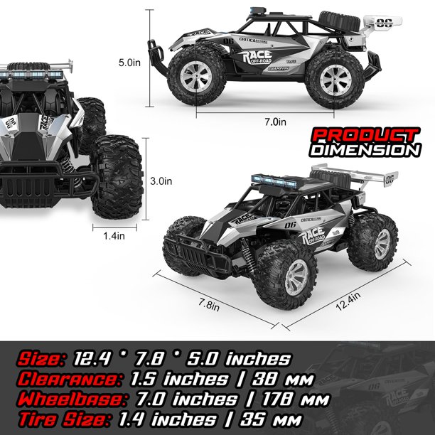 • Coches a control remoto a escala 1:12, camiones monstruo de alta velocidad de 20.5 mi/h para niños, auto de control remoto de 2.4 GHz con faro, dos baterías recargables incluidas para niños, niñas, niños y adultos - 33KM/H Speedy 1:12 RC Cars: ¡Alimentado por un fuerte motor RC 380, el coche a control remoto puede alcanzar velocidades de hasta 20.5 mi/h a toda velocidad! Disfruta de tus carreras con el control remoto sin demora de 2.4 GHz, que tiene una distancia de control de 164.0 ft. Gran camión monstruo todoterreno - Chasis ABS y marco de coche duradero: todo el chasis del coche a control remoto está hecho de plástico ABS y el cuerpo principal está hecho de material de aleación de aluminio, que es más duradero y con resistencia al impacto mejorada, menos peso de la carrocería del coche RC - Faros LED y luces de chasis: este camión monstruo de control remoto está equipado con un faro, iluminando la carretera por delante cuando juega por la noche. Nunca niegas este camión RC realista fenomenal a escala 1:12 - Tiempo de funcionamiento de 70 minutos y batería recargable de iones de litio: el automóvil utiliza una batería recargable de iones de litio de 7.4V 1400mAh, 2 baterías incluidas. Puede funcionar hasta 70 minutos a la vez (35 minutos por cada batería), lo que te permite experimentar horas de juego continuas e ininterrumpidas - RC Car Toy Gifts: un gran regalo para cumpleaños y muchas otras ocasiones. Si estás buscando un regalo emocionante y extra genial, te encantarán nuestros autos RC de grado de juguete. Pon tu trabajo en espera, sal con tus hijos y disfruta del tiempo en familia