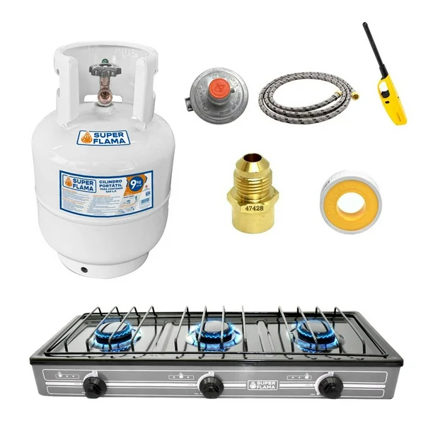 Combo TRIPLE FAMA Estufa 3 Quem, kit conexión y Tanque