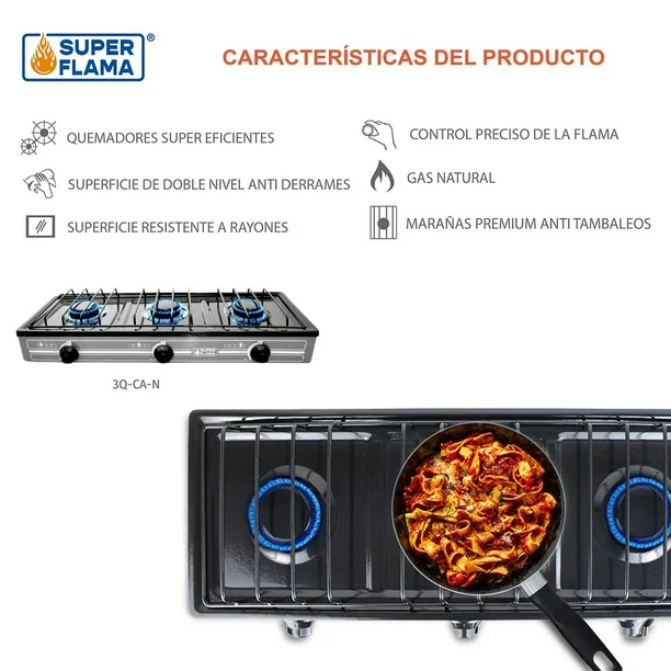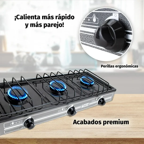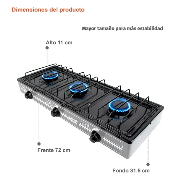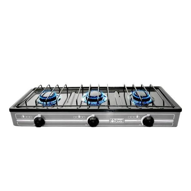 - Parrilla de gas de 3 quemadores con cubierta porcelanizada y cuerpo de lamina pintada