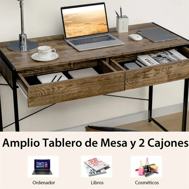 Hecho de tablero de partículas y con la estructura en acero para garantizar resistencia y duración|| Superficie espaciosa para poner ordenador, monitor, tazas, plantas y otro material de oficina|| Con 2 cajones espaciosos|| Almohadillas regulables para aumentar la estabilidad y proteger el suelo|| Amplio espacio debajo del escritorio para poner las piernas|| Diseño minimalista y a la moda que combina con los demás muebles|| Se puede utilizar como escritorio para oficina, mesa, escritorio para ordenador o consola|| Ideal para dormitorio, estudio, entrada, oficina, etc.|| Aguanta hasta 100 kg|| Superficie impermeable fácil de limpiar|| Fácil de montar con las instrucciones detalladas