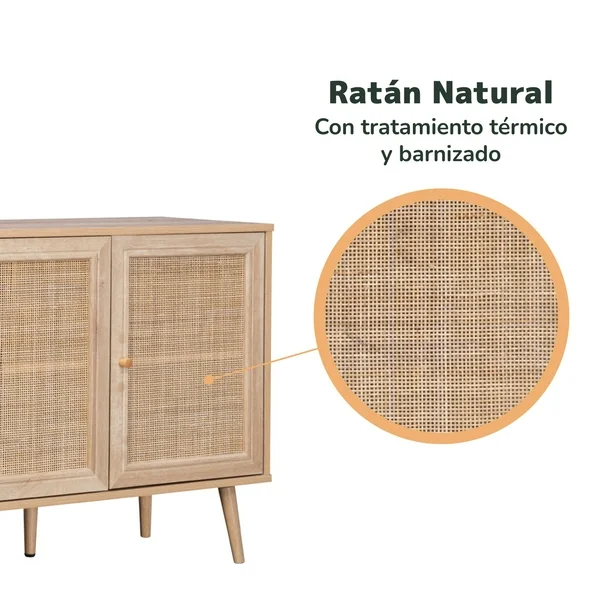 Disfruta de esta credenza bufetera y optimiza al máximo el orden de tus espacios. Este versátil aparador multiusos cuenta con un gran espacio de almacenamiento y es adecuado para diversos ambientes como salas, comedores, cocinas y más. Su moderno diseño en ratán con colores claros, es ideal para obtener un estilo decorativo cálido y artesanal.