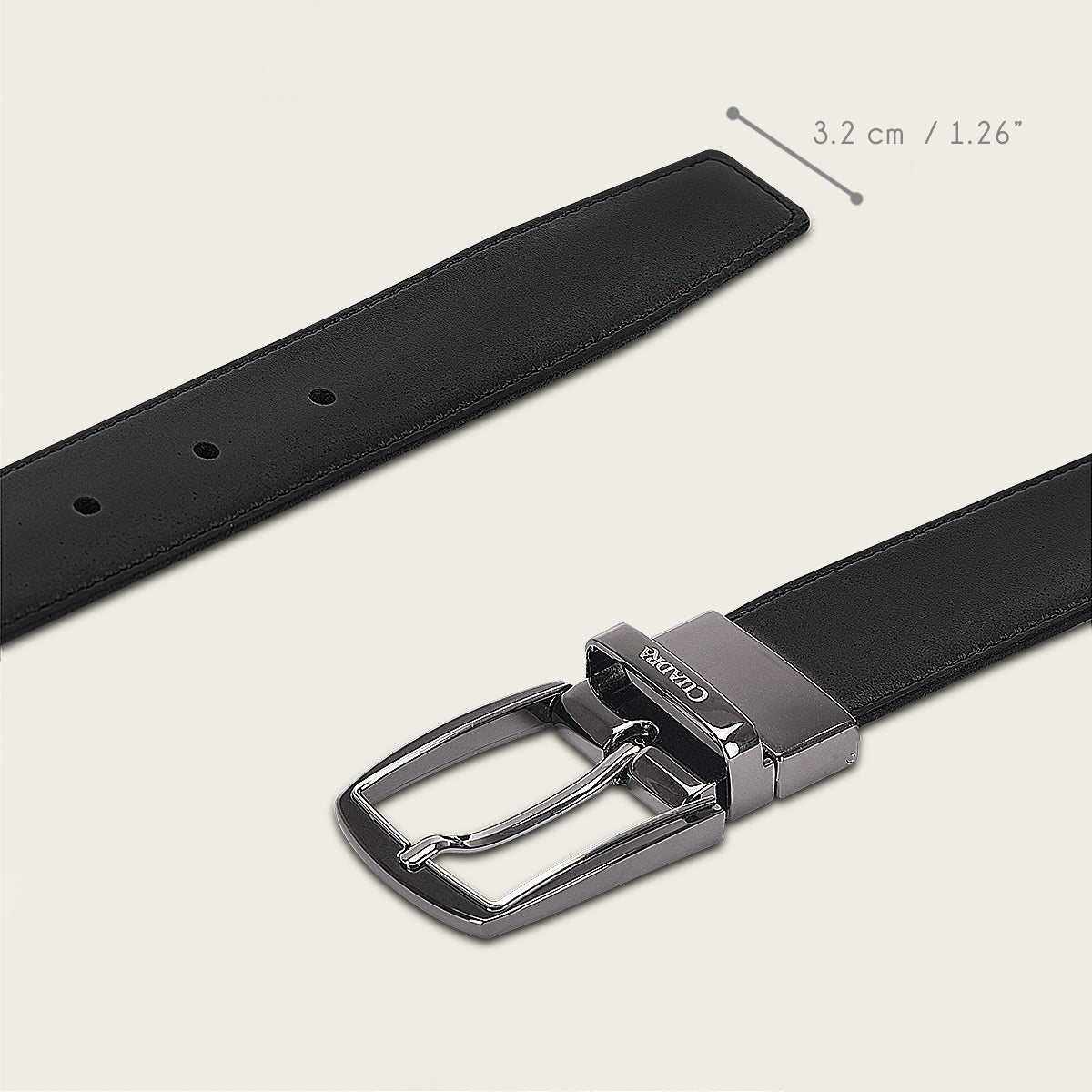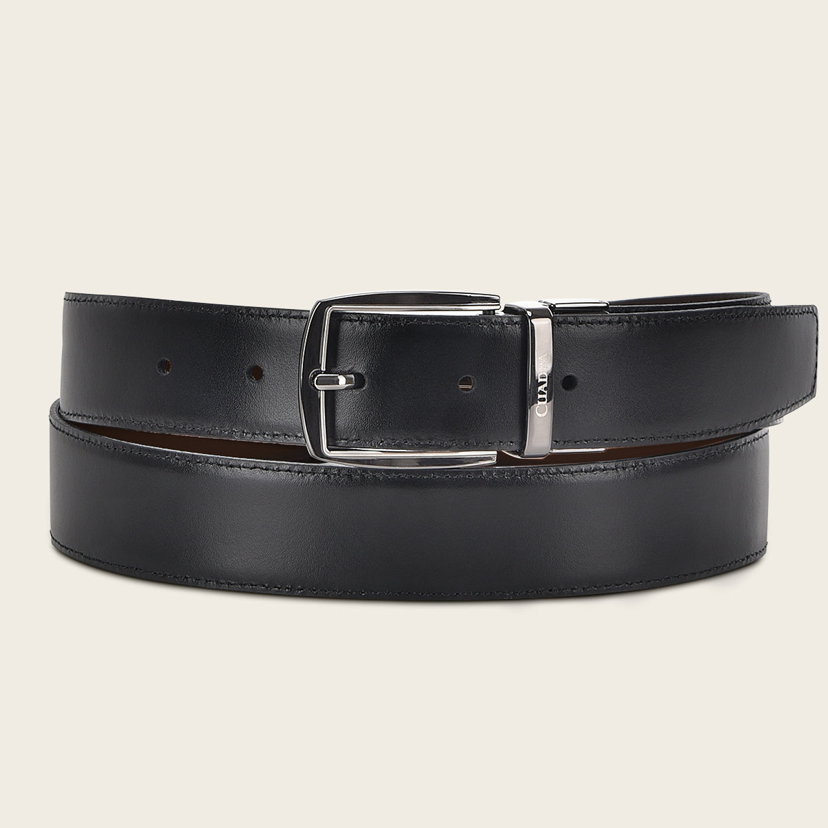 Cinturón reversible de vestir para caballero en piel de bovino color chocolate y negro. Con hebilla metálica reversible con grabado de logotipo Cuadra.