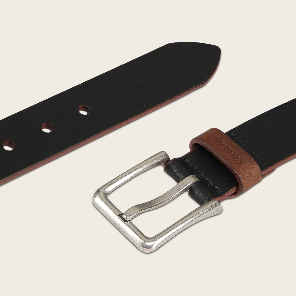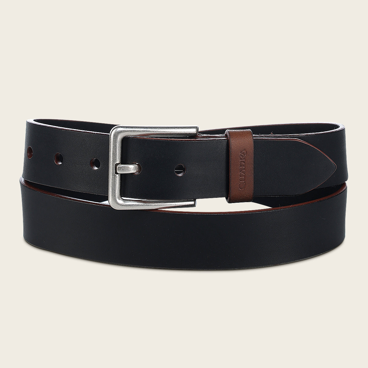 Cinturón para caballero en piel de bovino color negro. Con hebilla metálica y aplicación de logotipo Cuadra.