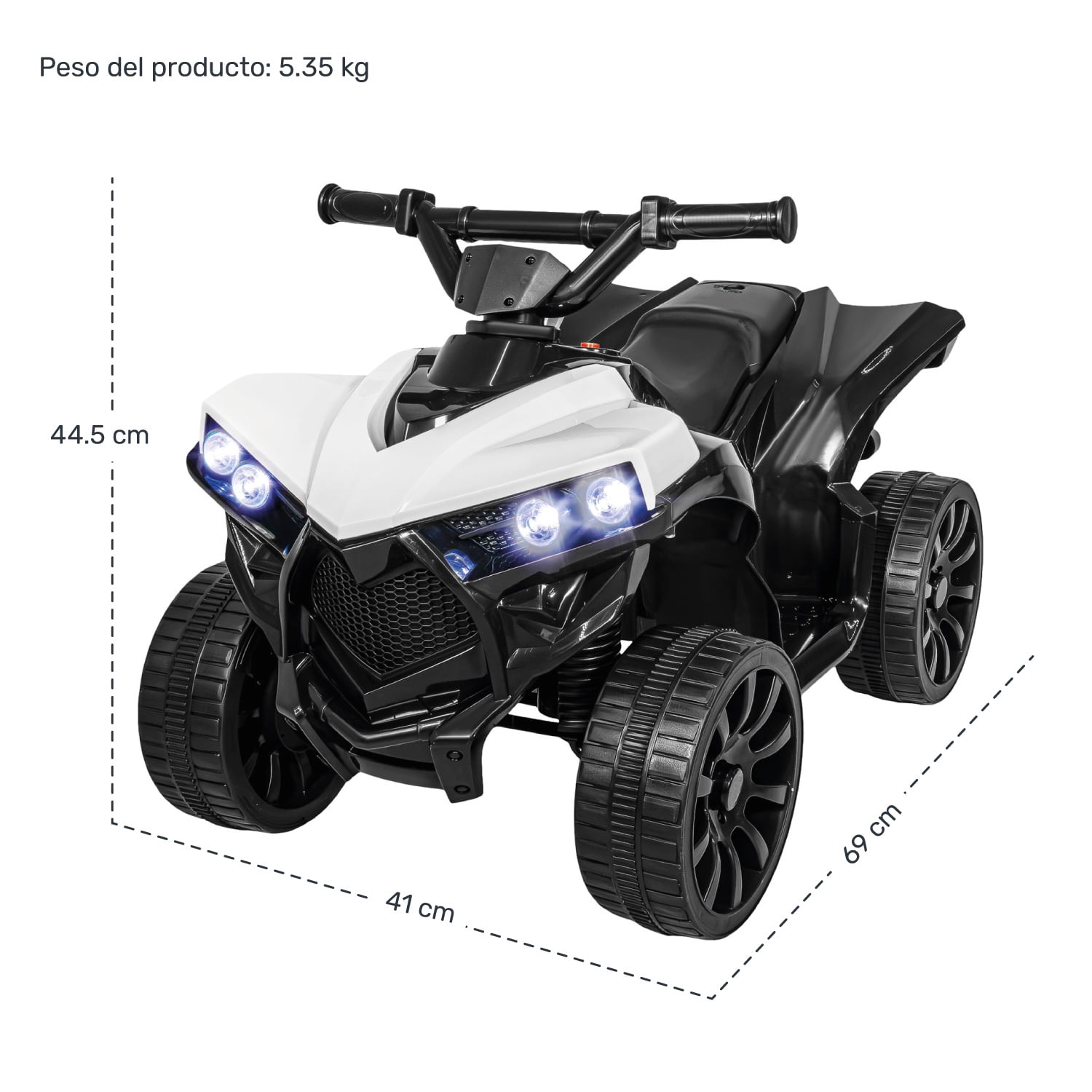 - • MINI CUATRIMOTO CON LUCES. Ofrece a los pequeños conductores una experiencia única, con faros vibrantes realistas que simulan una verdadera cuatrimoto. Perfecto para estimular la imaginación y la aventura de los niños, asegurando diversión en interiores y exteriores.