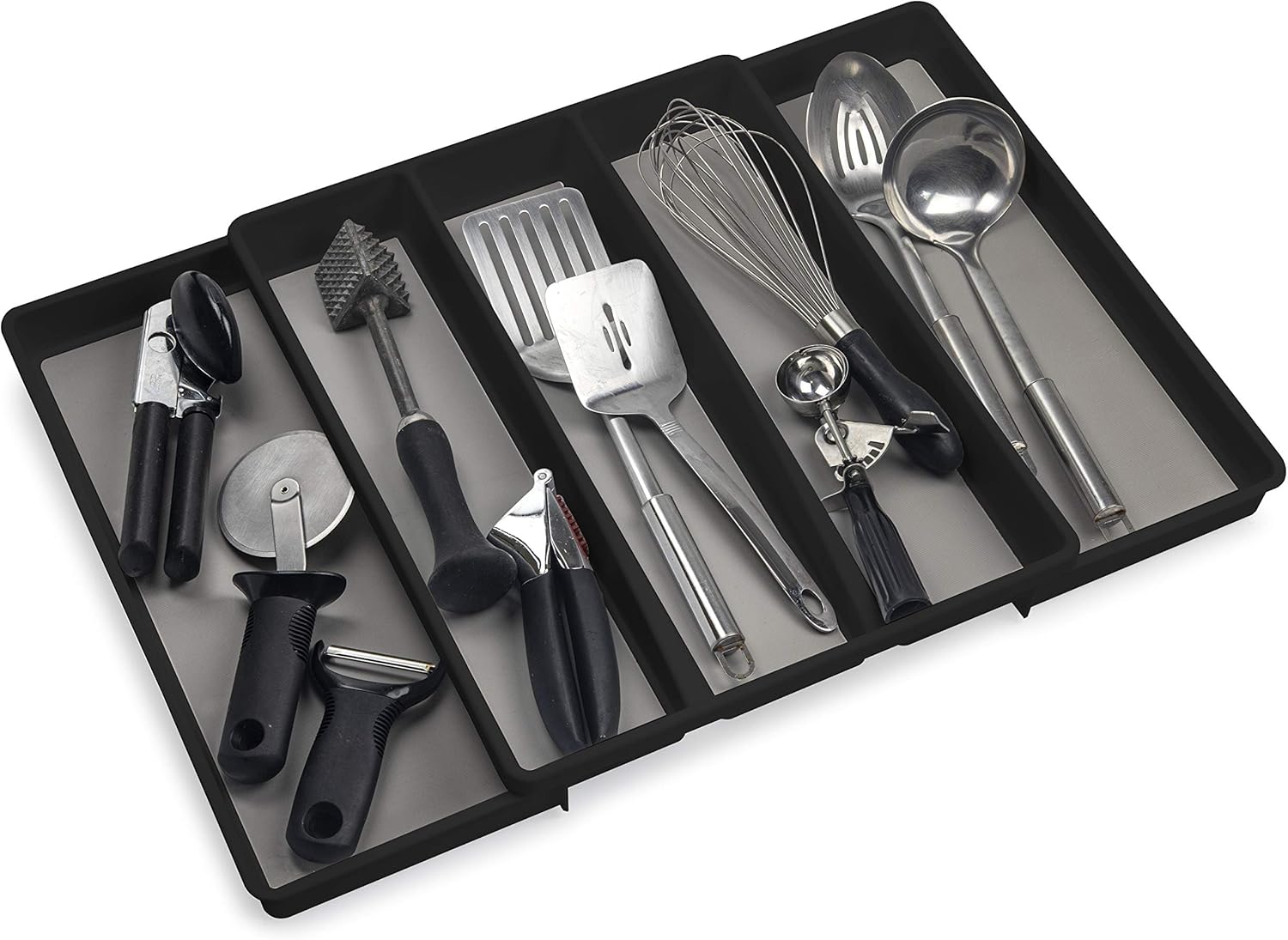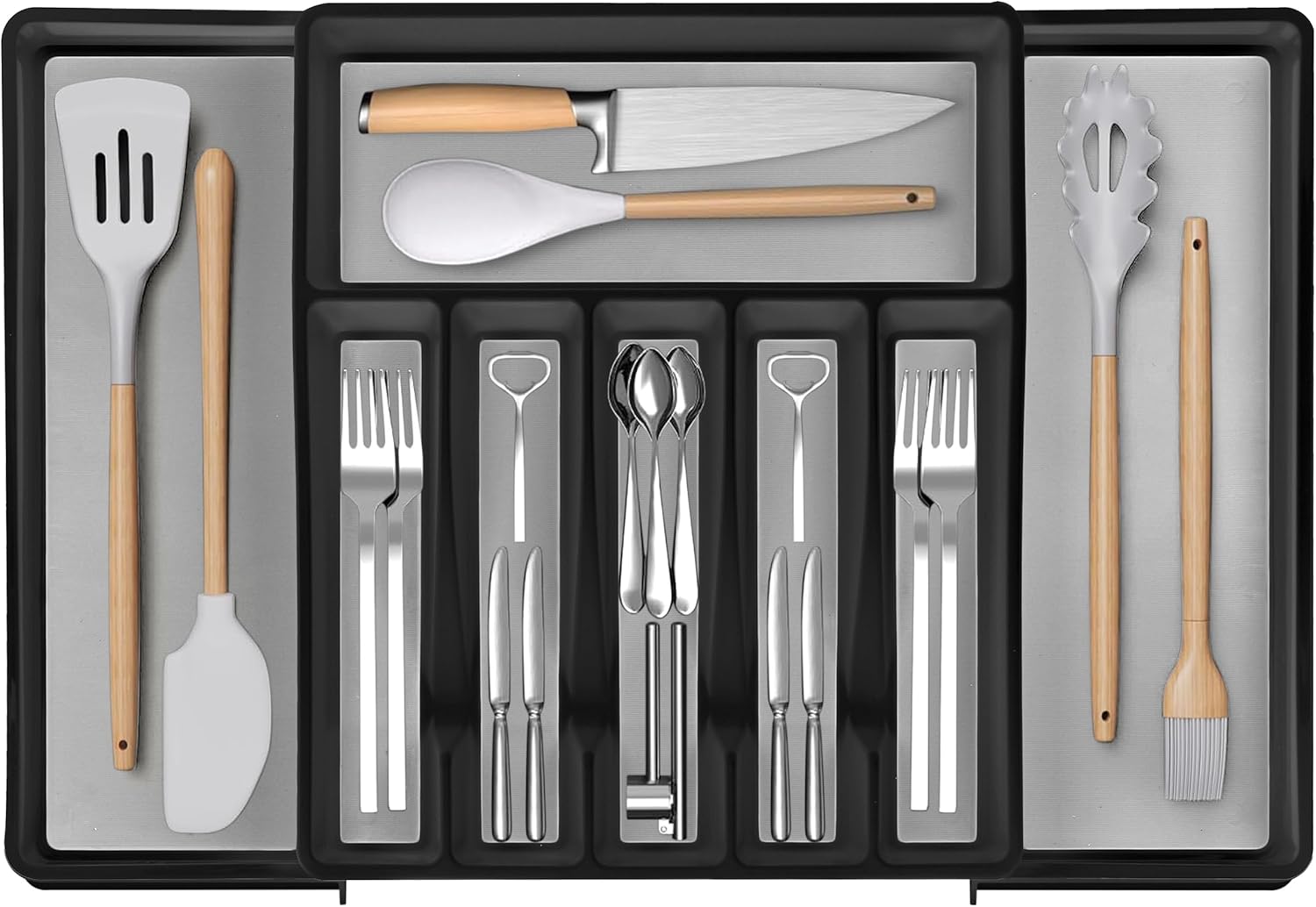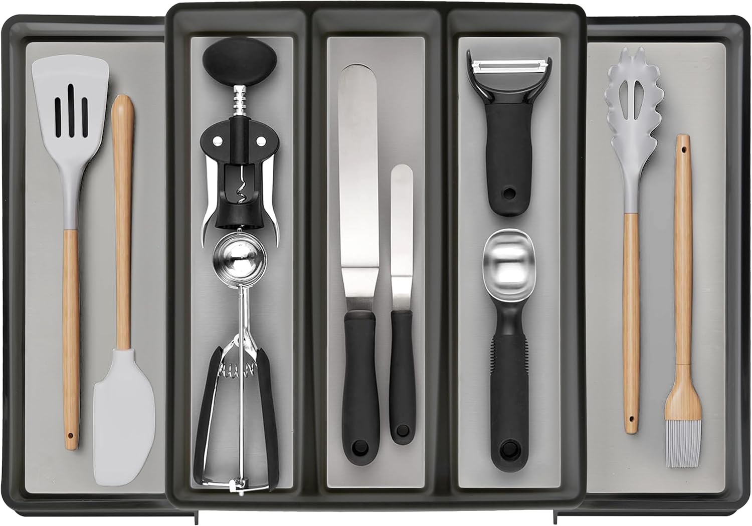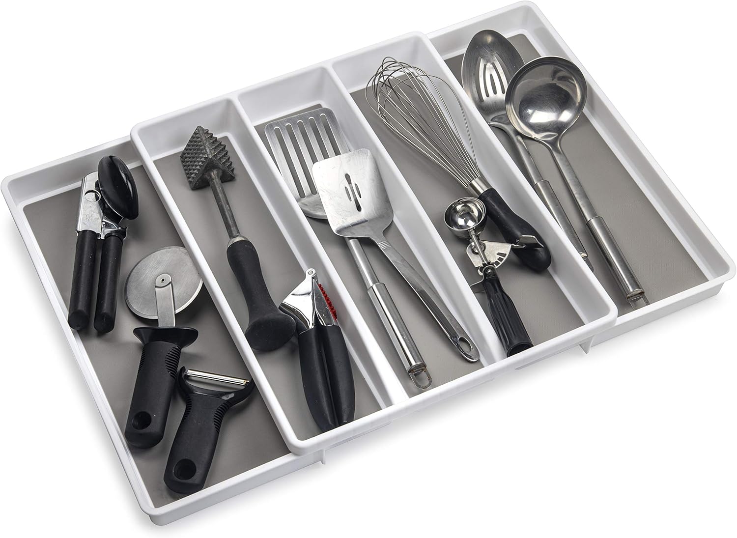 • Diseño antideslizante y expandible: con bases antideslizantes y compartimentos expandibles, este juego se ajusta para satisfacer tus necesidades de cocina. La bandeja de cubiertos se expande de 6 a 8 compartimentos, mientras que la bandeja de utensilios se expande de 3 a 5 compartimentos grandes
