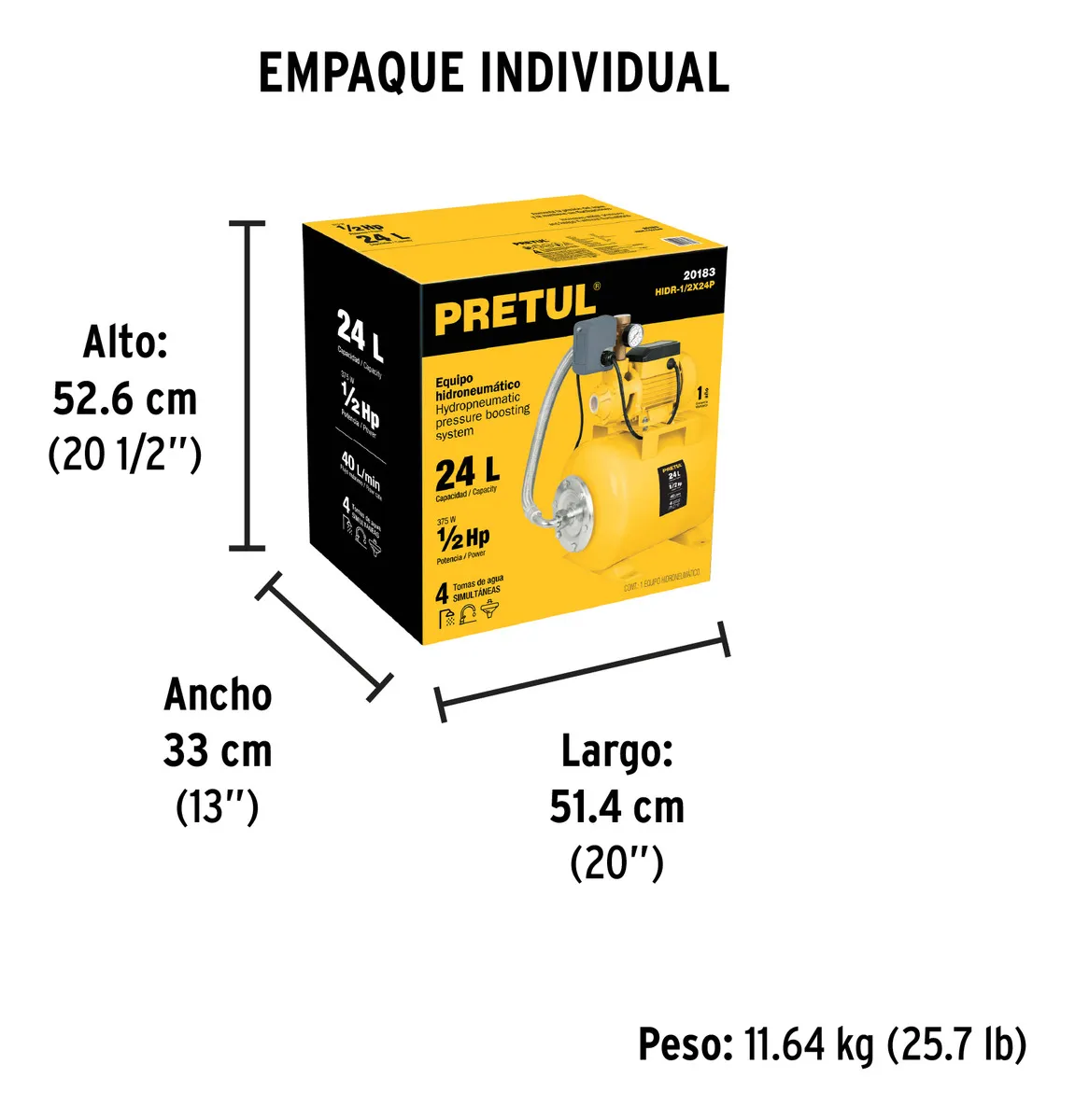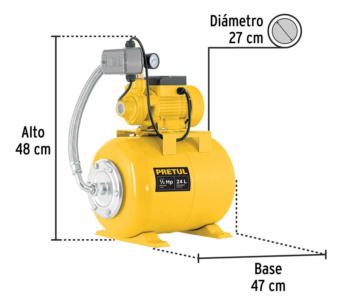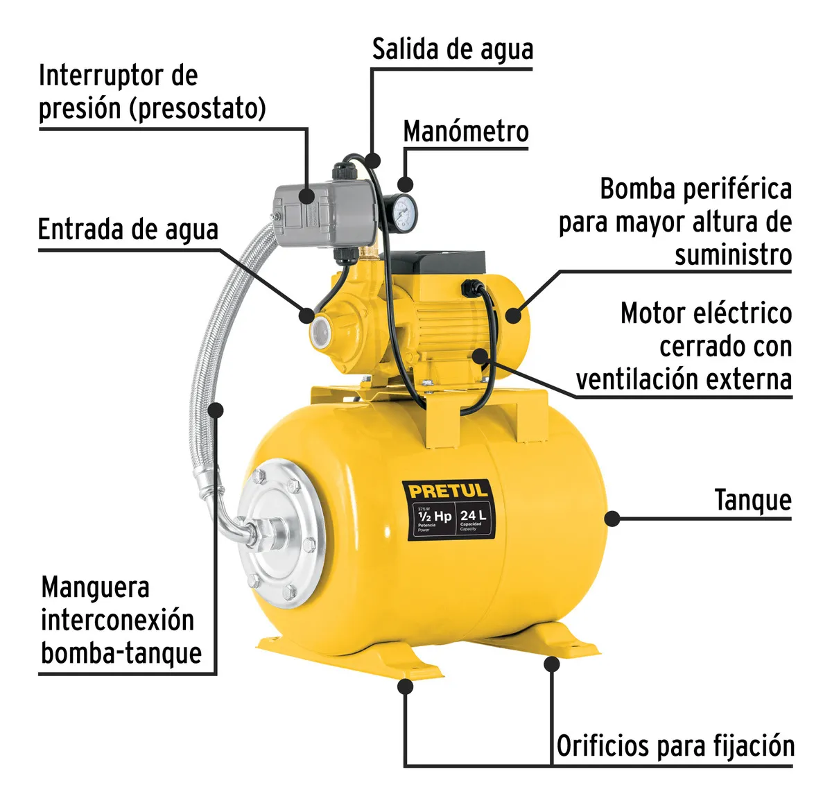 BOMBA HIDRONEUMÁTICA 1/2 HP, 24 LITROS, PRETUL