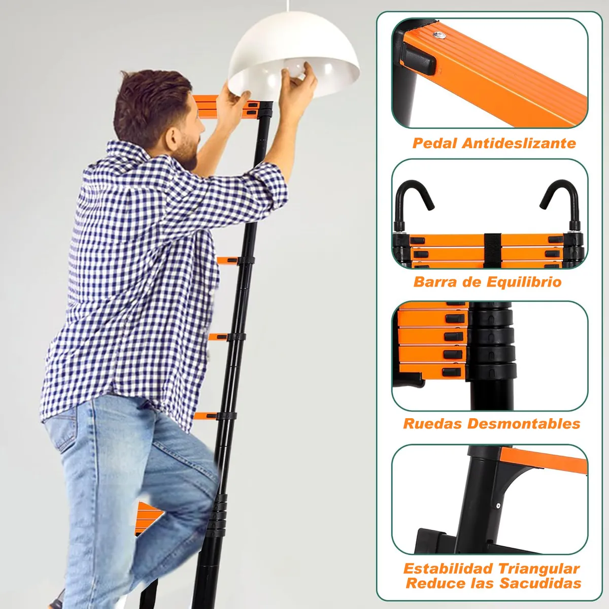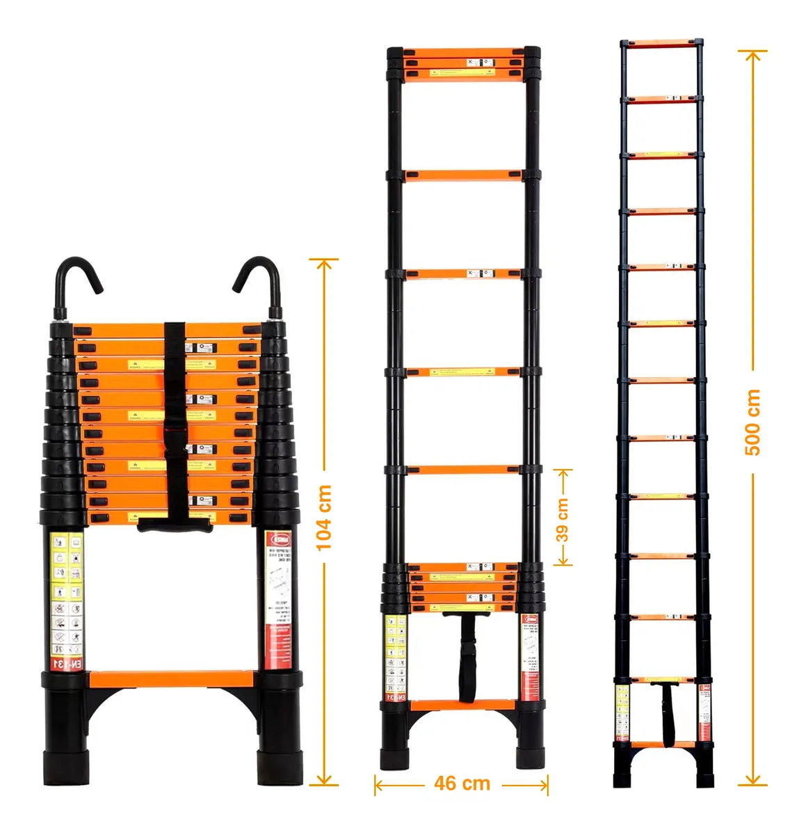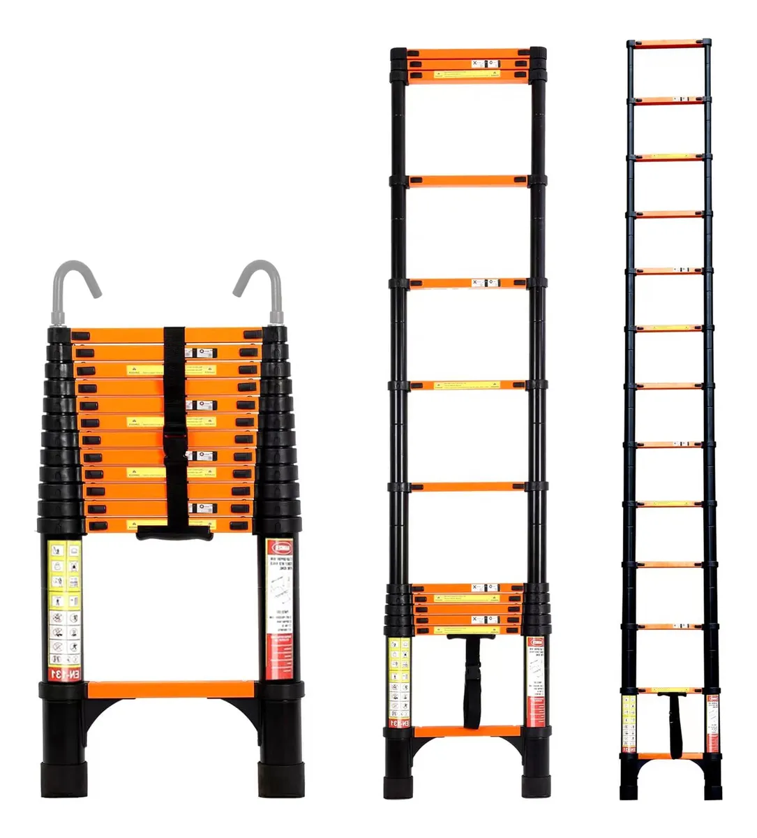 La escalera telescópica está hecha de aleación de aluminio premium 6061 de espesor, que es 0.03 mm más gruesa que los productos similares. Espesor de la pared del tubo de aluminio 1,5 mm. El tratamiento de oxidación de la superficie, la corrosión anti-desgaste, anti-corrosión, y la función de resistencia al envejecimiento de alta y baja temperatura son notables. Las piezas de plástico están reforzadas con fibras de nylon y la carga máxima es de 150 kg. La escalera telescópica está certificada de acuerdo con la norma de seguridad EN131.