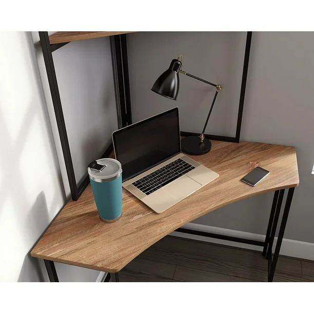 - Escritorio Esquinero Sauder Base Metal 167cm x 120 cm con 3 Niveles Home Office Color Café