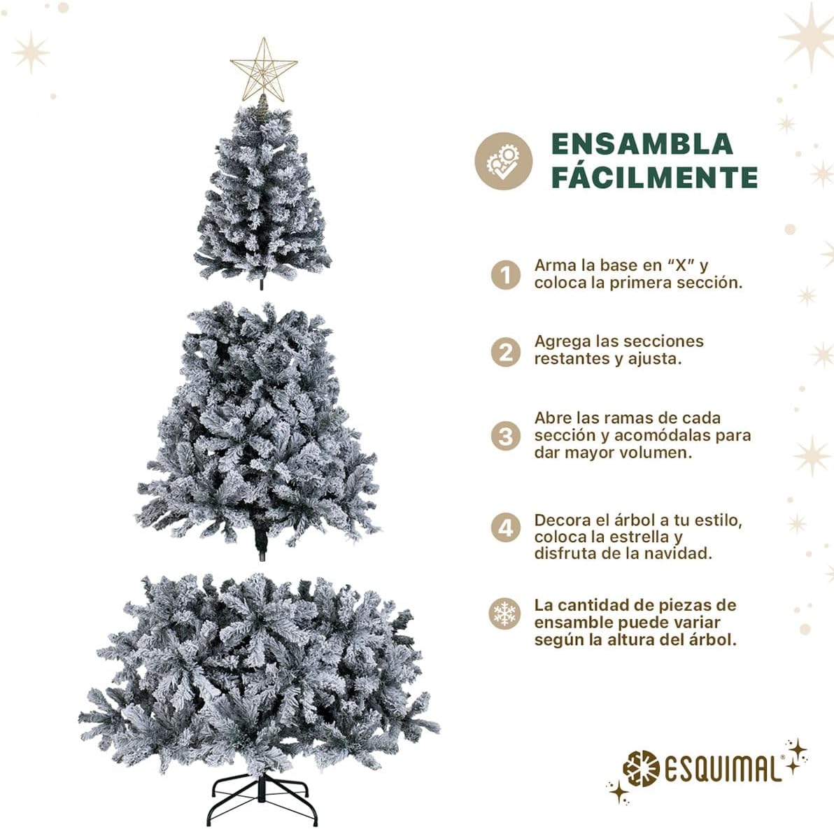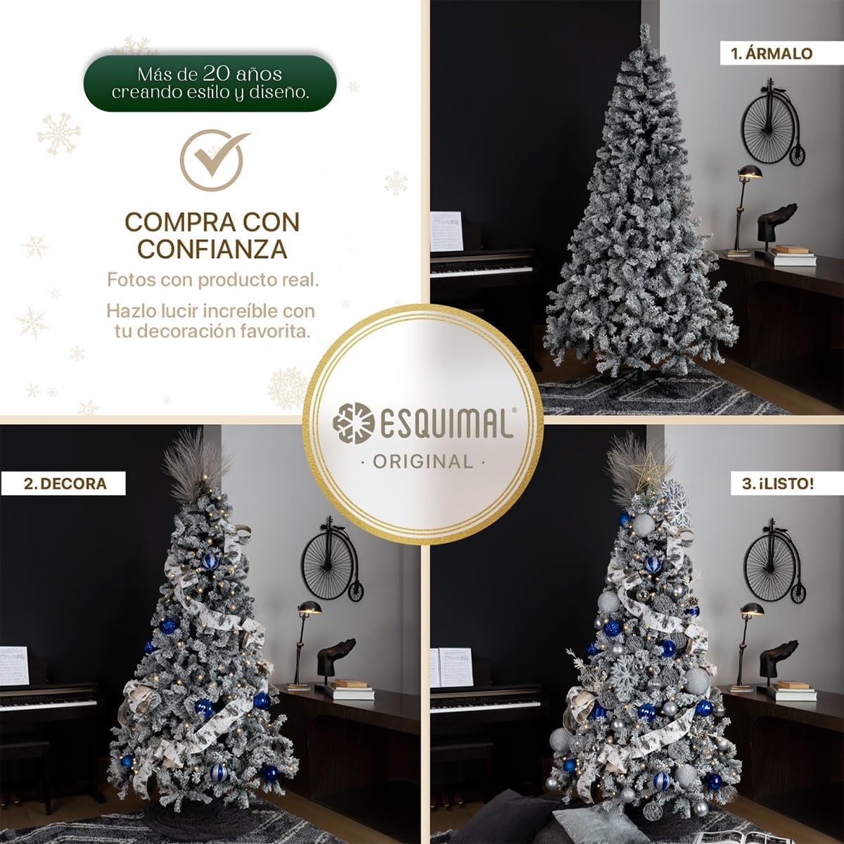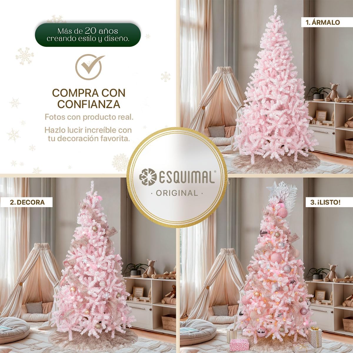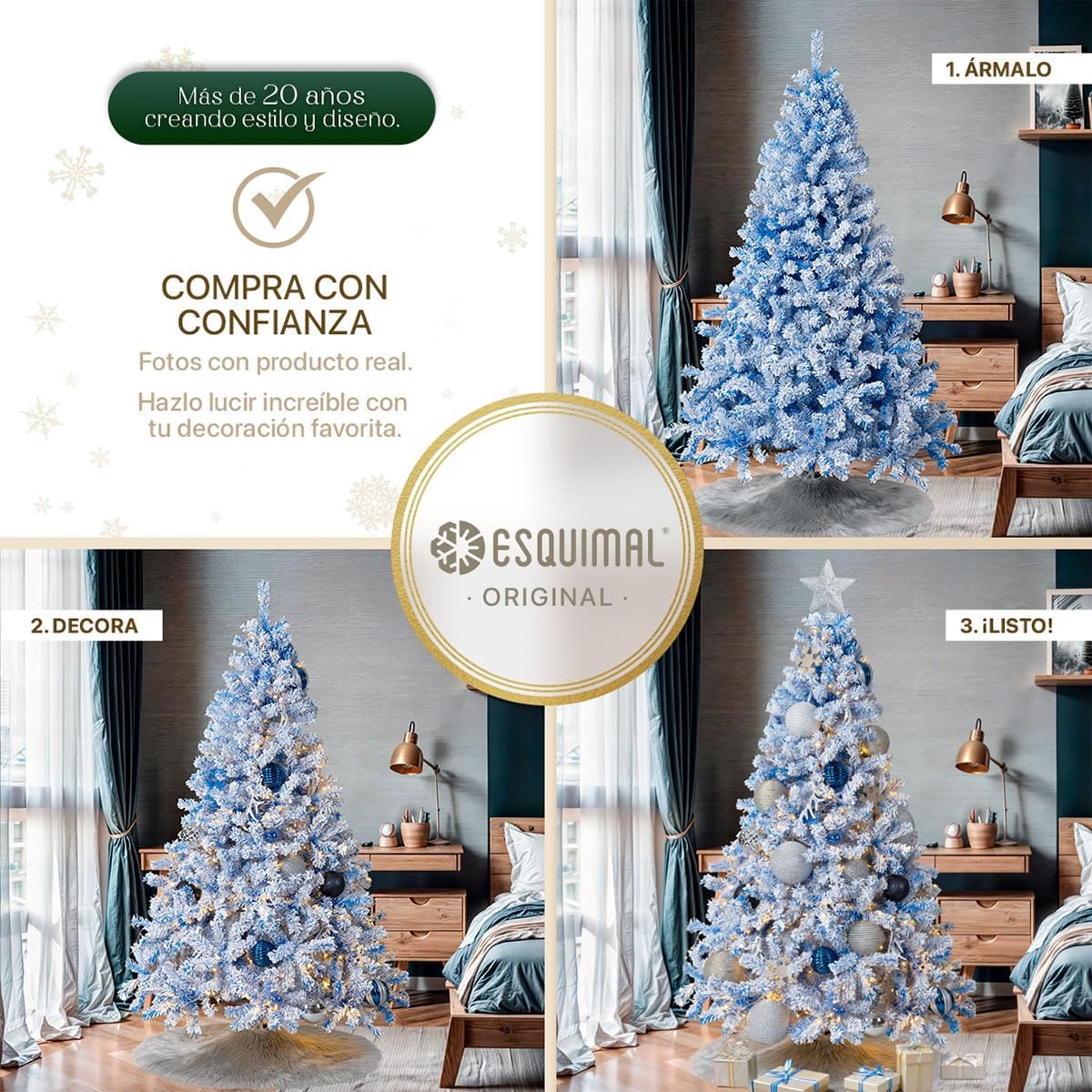 - DECORACIÓN INNOVADORA ESQUIMAL: Con más de 20 años de trayectoria y miles de familias satisfechas, Esquimal es referente de confianza para muchos hogares. Esta temporada invernal, nuestra colección de árboles y decoración navideña continúa acompañándote en la transformación de tus espacios con acabados mejorados y diseños únicos.