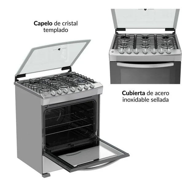 1 Estufa, 3 Parrillas, 6 Quemadores, 1 Comal 1 Parrilla De Horno, Capelo De Cristal, Manual De Uso E Instalación.