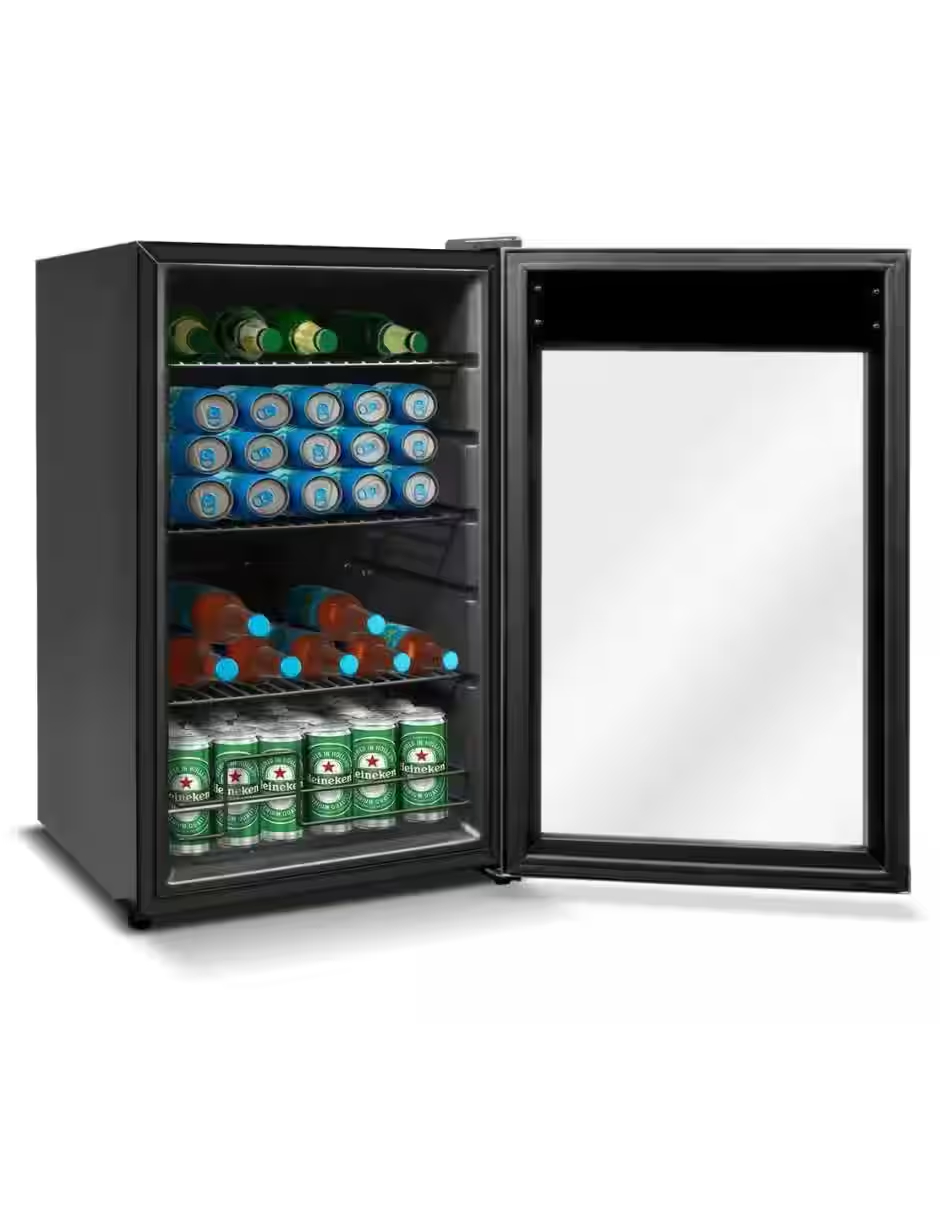 Frigobar con capacidad de 70 litros. Tecnología de última generación con luz LED blanca. Rango de temperatura de 3°C a 18°C. Gas refrigerante isobutano R600A. Pantalla digital touch. 5 niveles de ajuste. CARACTERÍSTICAS DEL PRODUCTO: AMPLIA CAPACIDAD. Mini refrigerador con capacidad de 70 litros diseñado para almacenar todas tus bebidas de tu preferencia manteniéndolos a una temperatura agradable para cada ocasión. Cuenta con tres rejillas removibles y 5 niveles de ajuste de altura para almacenar envases de tamaños variados. CONFORT. El diseño del frigobar está pensado para contrastar con diversos ambientes. Fabricado con acero inoxidable y una puerta con vidrio templado de fácil manipulación es ideal para resaltar con elegancia. Cuenta con un compartimento inferior para resguardar tus snacks favoritos. BOTONES TÁCTILES. Último en tecnología, cuenta con una pantalla digital con botones táctiles para configurar las siguientes opciones: Botón de luz / cambio de grados C° a F°. Botón de aumento de temperatura. Botón de disminución de temperatura. Botón de desbloqueo. TEMPERATURA REGULABLE. La temperatura del frigobar puede ser regulable entre los 3 y 18 grados centígrados. Como característica especial, integra iluminación LED de color blanco en la parte superior frontal de la estructura del mini refrigerador. Utiliza gas refrigerante isobutano R600A. USOS. Por su fabricación su uso es ideal para terrazas, habitaciones domésticas, habitaciones hoteleras, posadas, bares, barras, pent-house, antros, oficinas, supermercados, dormitorios compartidos, eventos de jardín y mucho más. Sus especificaciones también lo hacen ideal para usar en sala de estar, hospitales y clínicas. DATOS TÉCNICOS: Medida con puerta abierta: 84 x 49 x 74.5 cm. Voltaje: 110 V. Frecuencia: 60 Hz. Potencia: 95 W. Distancia entre rejillas: Se pueden colocar cada 8.5 cm / cuenta con 5 niveles de ajuste Medidas de rejillas: 2 rejillas: 36 x 30 cm (largo y profundidad) / 1 rejilla: 36 x 16.5 cm (largo y profundidad). LED: 4 LED’s. Compresor: B35C5B HUAYI Compresores Herméticos. Refrigeración (kCal/h): 56. Inversor (tensión de entrada mínima): 49. COP (W/W): 0,95. Desplazamiento (cm³): 3.50. Régimen de aplicación: LBP. Sistema de refrigeración por gas. Capacidad de descargas: 84 descargas. Longitud del cable: 140 cm. Capacidad: 70 litros. Manija: 2 x 4.5 x 39 cm. Tornillería: 2 tornillos M4 x 30 mm. INCLUYE Frigobar. Manija de puerta. MEDIDAS DEL PRODUCTO: Largo: 43.5 cm, Ancho: 49 cm, Alto: 74.5 cm. PESO DEL PRODUCTO: 21.25 kg. MEDIDAS DEL EMPAQUE: Largo: 50 cm, Ancho: 47 cm, Alto: 76 cm. PESO DEL PRODUCTO EMPACADO: 22.85 kg