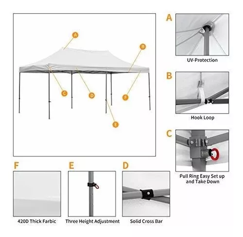 USO MÚLTIPLE: Nuestra carpa con dosel de alta calidad se puede transportar convenientemente y se perfecto para muchas necesidades al aire libre; adecuado para barbacoa en el patio trasero; parte ies, deportes al aire libre y otros eventos comerciales; Disponible para día lluvioso y soleado. MATERIAL: tela Oxford 420D resistente al costado, parte superior gruesa resistente al agua; cada pared lateral podría usarse individualmente; El marco de acero resistente y duradero y los nuevos conectores de doble capa garantizan la estabilidad. TAMAÑO GRANDE: El tamaño de la carpa exterior es de 10 x 20 x 10,8 pies; proporciona alrededor de 200 pies cuadrados de cobertura de sombra; cubre 20 personas para tus eventos comerciales. FÁCIL DE MONTAR: No se requieren herramientas adicionales; simplemente mantenga el marco estable cuando monte los tubos de acero y la cubierta de la carpa del dosel. AJUSTE DE ALTURA DE 3 POSICIONES: Prácticas patas telescópicas; tres configuraciones de altura por cada 3.46", altura superior 10.5 pies
