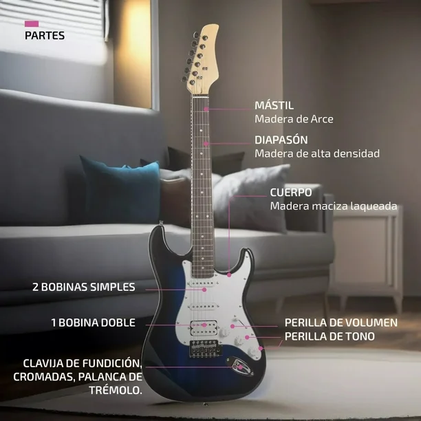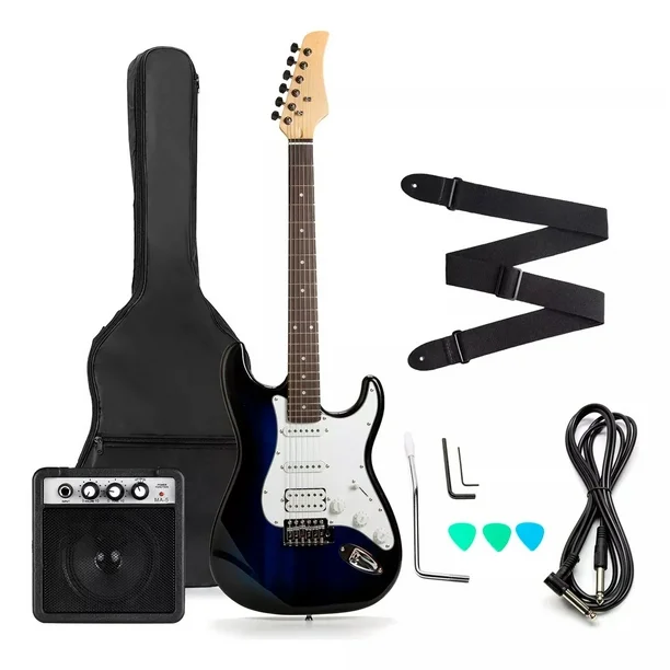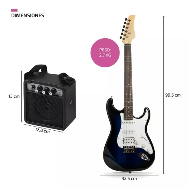 -Incluye funda para guitarra de poliéster 600D, cable, mini amplificador MA-5, barra de golpe, palanca de trémolo, correa, 2 llaves allen para ajustes finos, 3 púas / selectores y un juego extra de cuerdas.