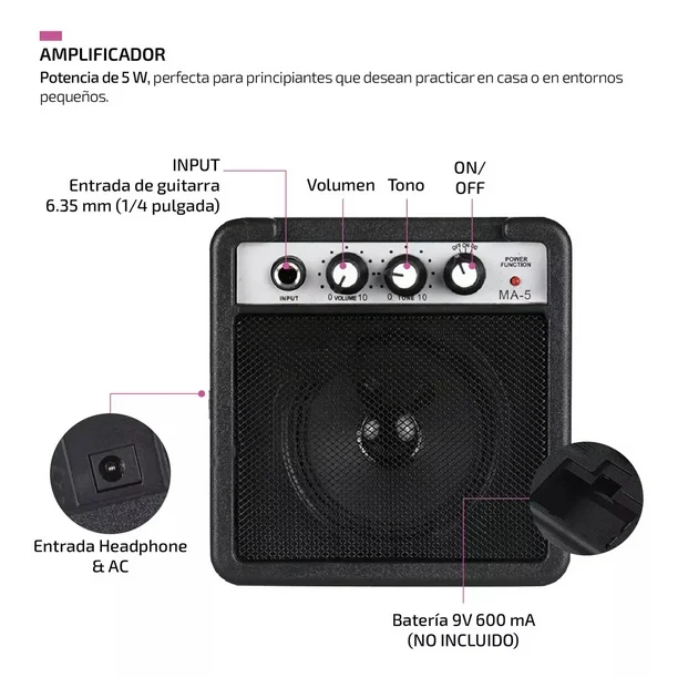 • Características del Amplificador: -Potencia de 5 W, perfecta para principiantes que desean practicar en casa o en entornos pequeños con Ajuste de tono de volumen Overdrive. -Funciona con batería de 9 V o fuente de alimentación de 9 V 600 mA (no incluidas) para mayor comodidad -Dimensiones compactas de 20 cm de alto x 23 cm de ancho x 13 cm de profundidad y liviano para facilitar su transporte. Su diseño portátil es perfecto para quienes necesitan llevar su equipo a lugares como estudios de grabación o pequeños locales. -Con entrada de 6,35 mm (1/4 de pulgada) para conectar guitarra eléctrica y otros instrumentos o dispositivos musicales. -La salida de 6,35 mm (1/4 de pulgada) le permite conectar auriculares para practicar su guitarra sin molestar a sus vecinos.