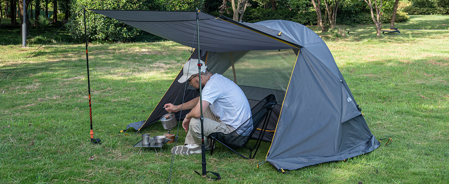 - Dos puertas con capota impermeable, diseñadas con vestÃbulo. Puedes sostener una puerta lateral con postes de senderismo (no incluidos) y cocinar tus comidas bajo la pequeña lona.