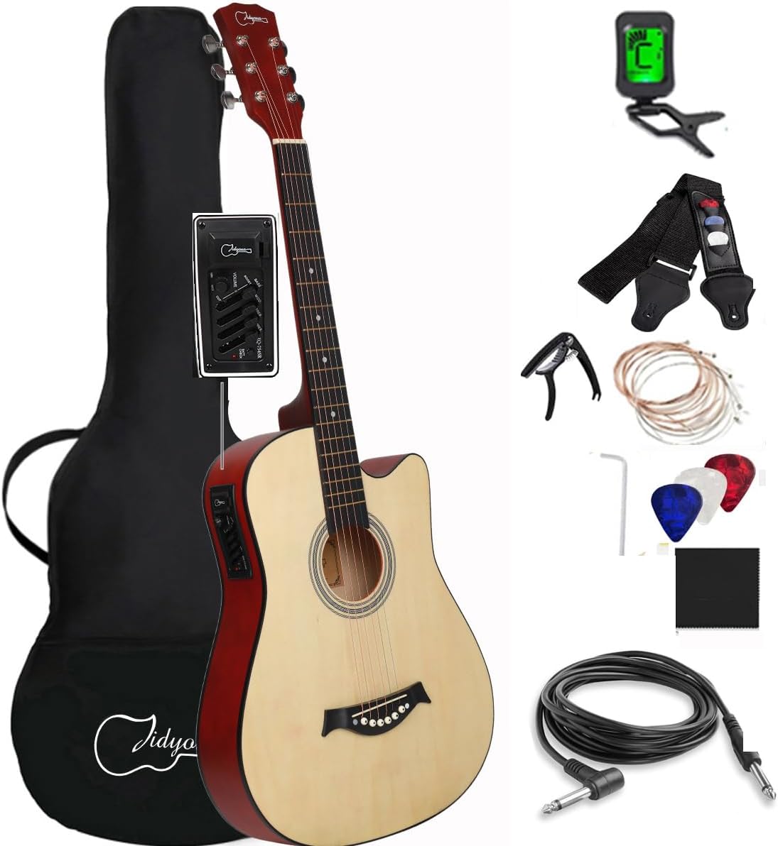 Jidyous electricacústica 38 inch Acústica Clasica guitarras Funda Y Accesorios, con correa, afinador, un paquete de cuerdas adicionales, capo, paño de limpieza, 3 púas, bolsa de concierto (Natural)