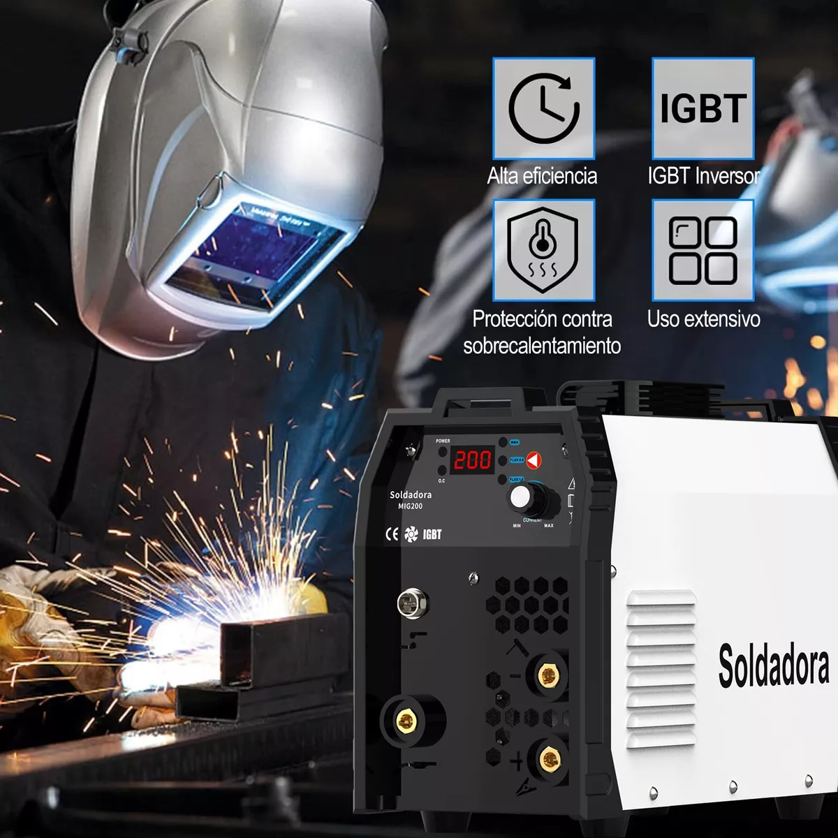 El soldador incorpora tecnología inverter IGBT, con función de arranque en caliente y antiadherente, soldadura estable, fuerte penetración y bonitos cordones de soldadura. Está equipada con protección de seguridad contra sobrecorriente, sobretensión, sobrecarga y sobrecalentamiento para garantizar un funcionamiento seguro y prolongar la vida útil de la soldadora.