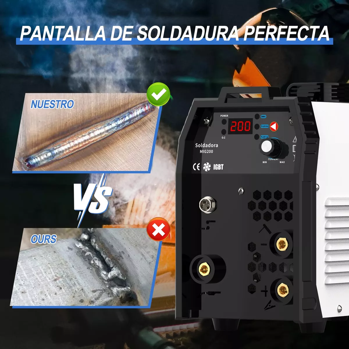 La máquina de soldar está equipada con doble voltaje 110V/220V (viene con un cable de conversión de 110V hembra a 220 macho), puede adaptarse automáticamente al cambiar el voltaje. Su eficiencia es 30% mayor que el arco tradicional. Consigue mejores soldaduras con menos trabajo, siendo potente y eficiente.