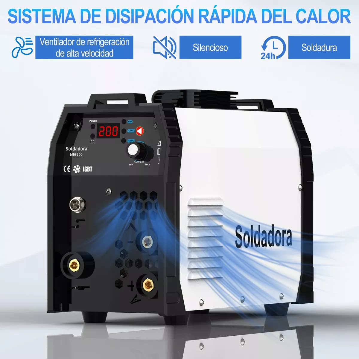 Esta soldadora está equipada con un ventilador de refrigeración interno, que puede enfriar la soldadora mientras está en uso, y puede mejorar efectivamente la eficiencia de trabajo de la soldadora, así como la duración de uso.