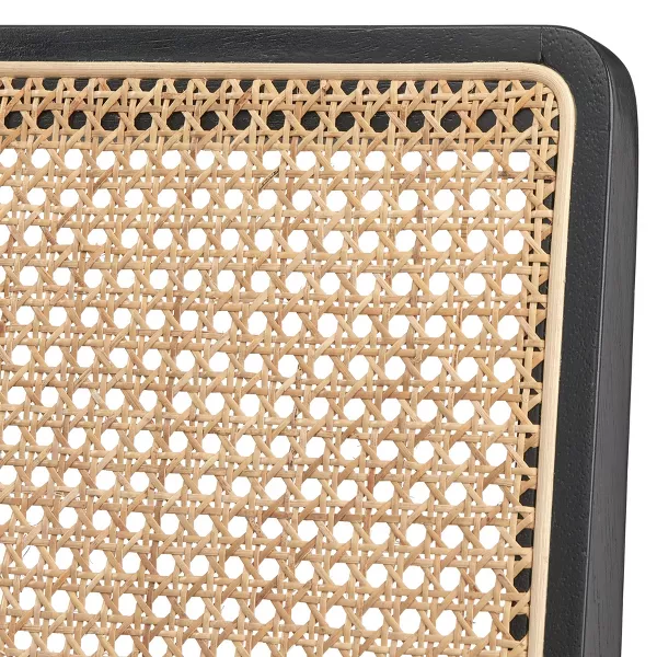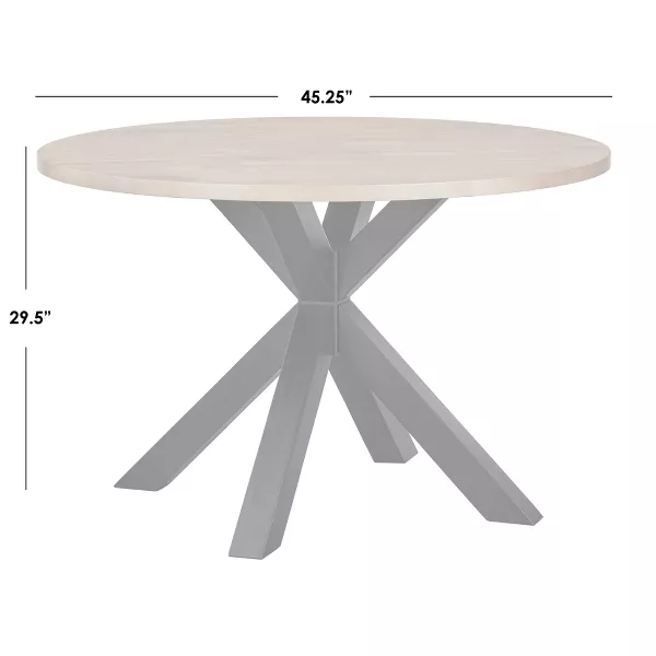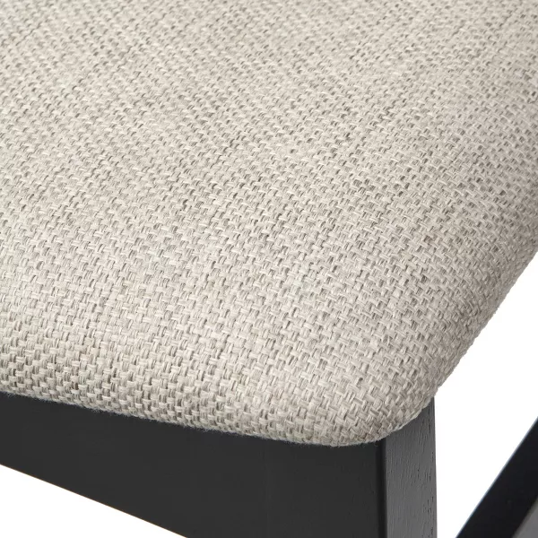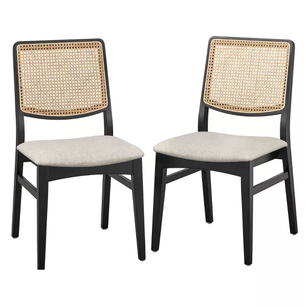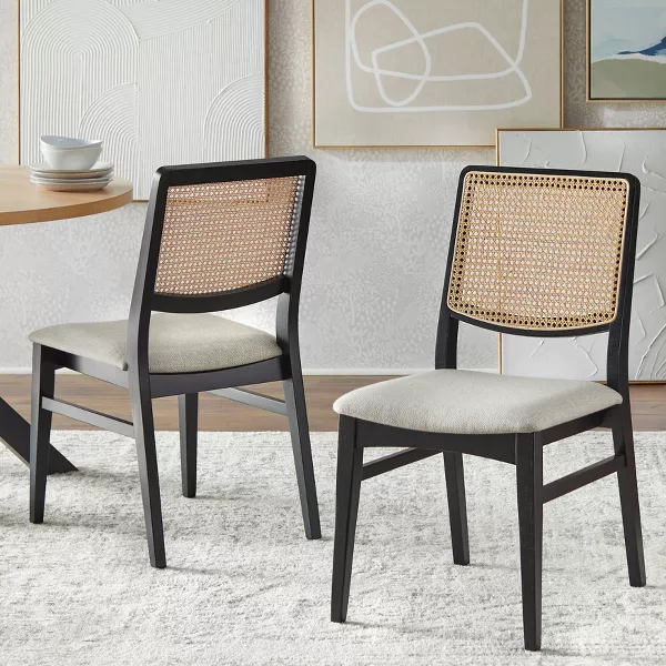 Reimagine your dining space with the addition of the 5pc Gilcrest Round Dining Set by Lifestorey. Mid-Century modern flair accentuates the unique angled legs and two-tone finish of the 45-inch diameter table that seats up to four comfortably. Mixed materials refresh the modern chair style, featuring a textural inlay of natural cane against a solid rubberwood frame. Cushioned seats upholstered in a soft neutral gray linen-like fabric create a striking tonal contrast against the rich black finish. Ideal for either a formal dining room or casual kitchen space.