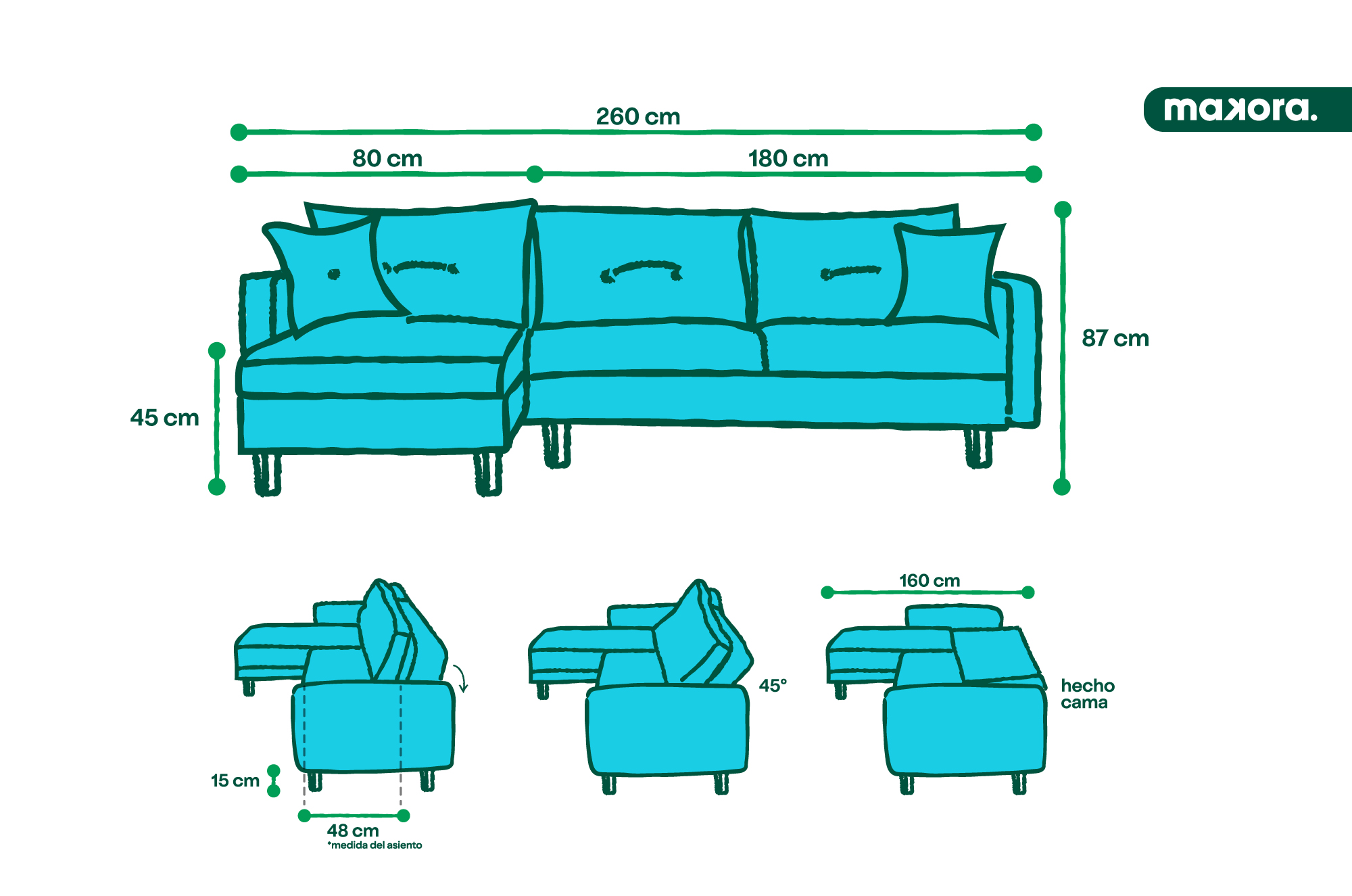 La Sala Modular Sunny es perfecta para cualquier espacio, con un concepto que hace que tu experiencia de compra sea inigualable gracias a que la puedes convertir en una gran cama. En Makora priorizamos la calidad con materiales durables y fáciles de limpiar.