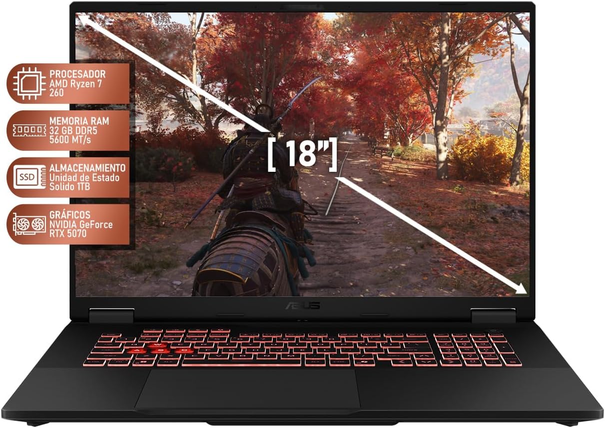 La ASUS TUF Gaming A18 es una potente laptop diseñada para gamers y usuarios exigentes que buscan alto rendimiento y durabilidad. Equipada con un procesador AMD Ryzen 7 de última generación y una tarjeta gráfica dedicada NVIDIA GeForce RTX 5070, esta máquina garantiza un desempeño fluido tanto en juegos modernos como en tareas intensivas como edición de video o modelado 3D. Su pantalla de 18 pulgadas con alta tasa de refresco ofrece una experiencia visual inmersiva y nítida, ideal para disfrutar al máximo de cada detalle. Además, cuenta con un sistema de refrigeración avanzado, diseño robusto con certificación militar y un teclado retroiluminado optimizado para largas sesiones de uso.