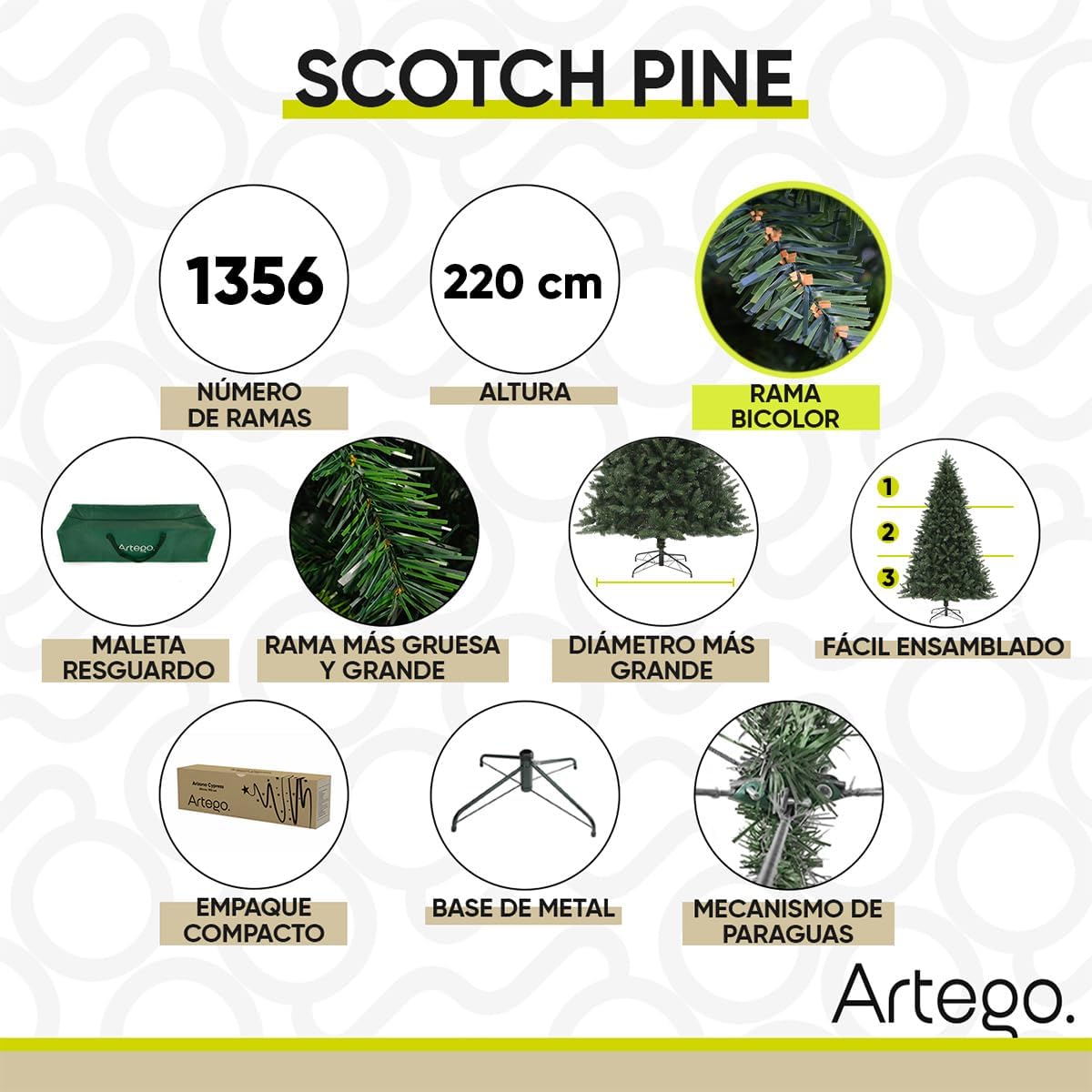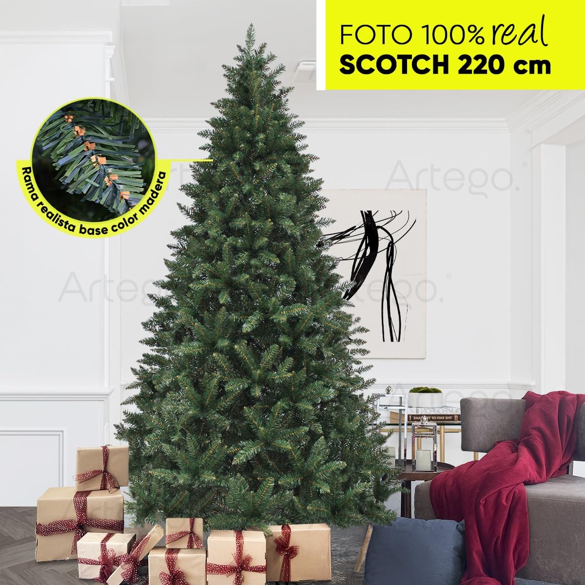 BECKON Árbol de Navidad Pino Scotch Pine Premium *2.20m* Artego Artificial Frondoso + Maleta/Christmas Tree *1.60m 1.90m 2.20m* Decoración navideña (Scotch 220cm)