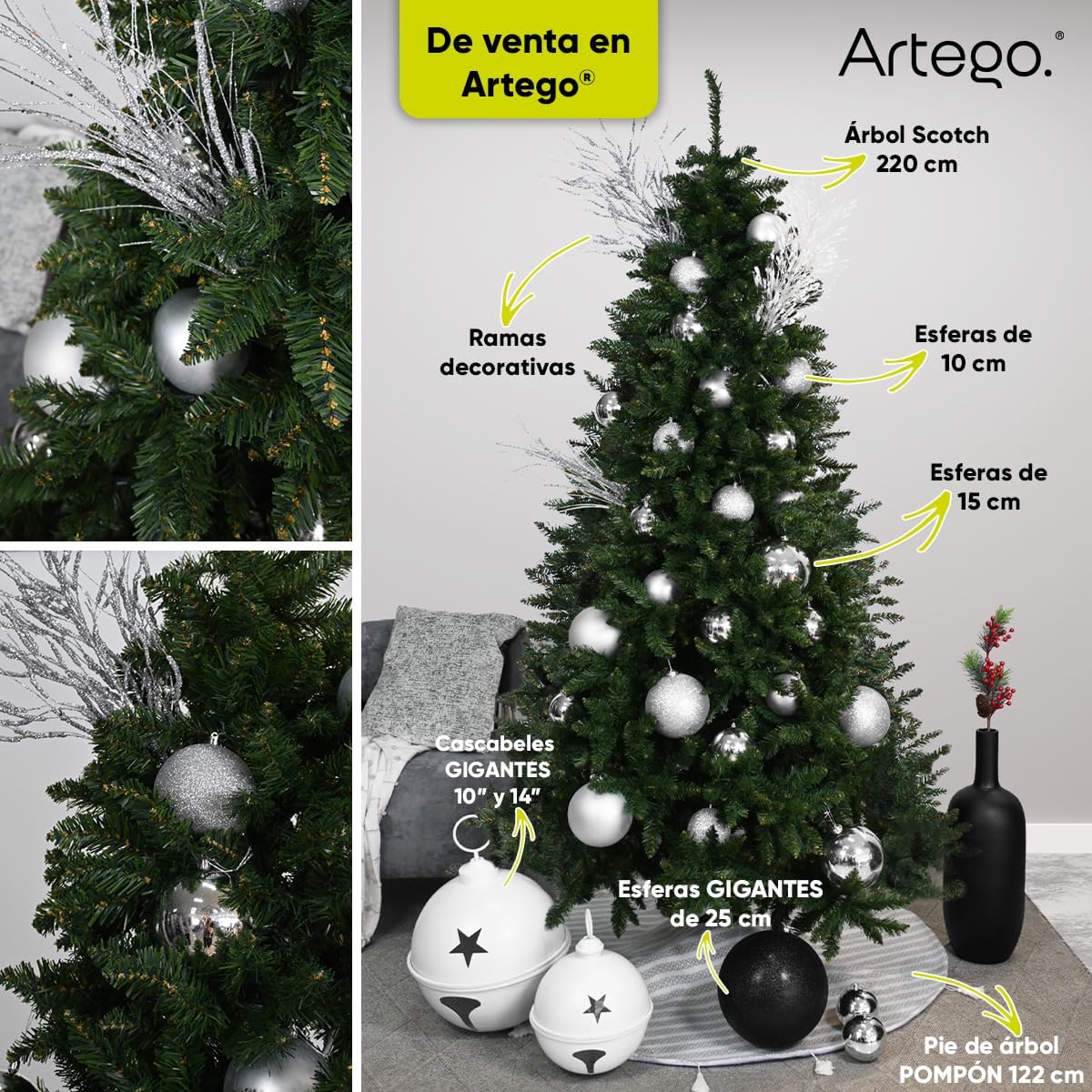 • 1 – Árbol de navidad artificial con altura de 2.20m // Ramas bicolor, para un efecto más natural y elegante.