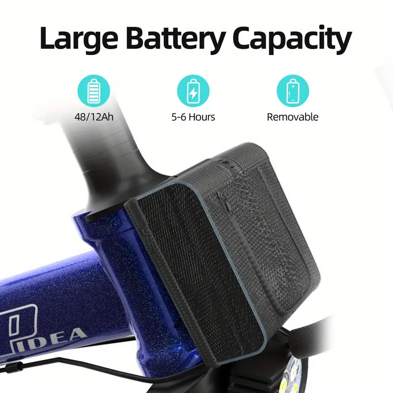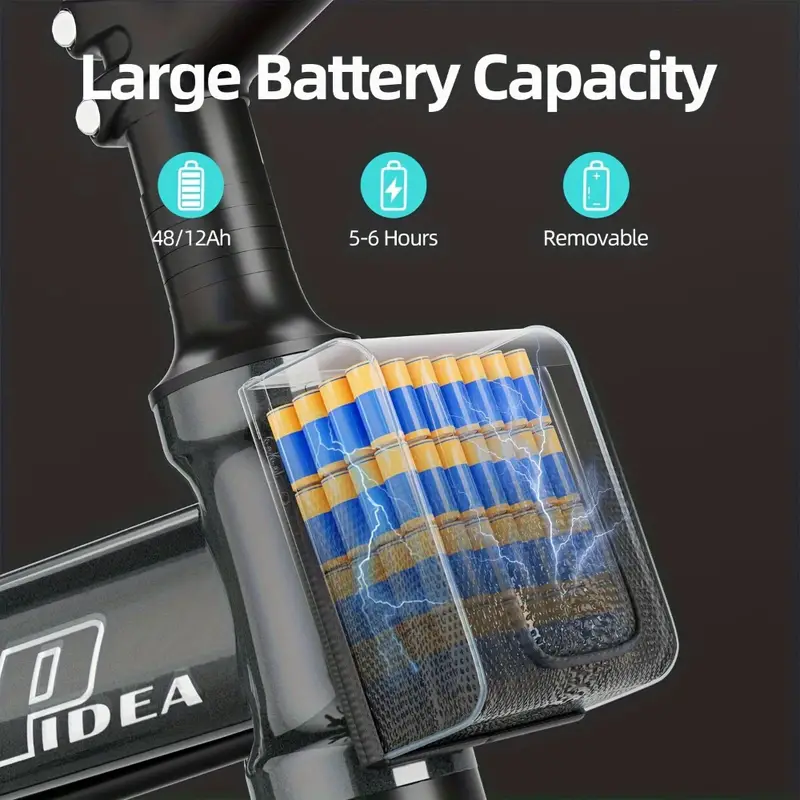 Potente motor de 500 W para velocidad y rendimiento Batería de litio extraíble de 48 V y 12 Ah para una potencia duradera 5 modos de potencia y 21 velocidades para versatilidad y control Diseño plegable para un fácil almacenamiento y transporte Medidor inteligente LED para monitorear la velocidad y la duración de la batería Hasta 50 millas de alcance con una sola carga Ligero y portátil para aventuras en movimiento Adecuado para viajes diarios, aventuras todoterreno y paseos de ocio Fácil de montar y mantener