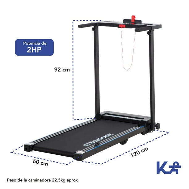 - Medidas generales (LAxANxAL): 120x60x92 cm; Plegada: 121x58x12.5 cm. Medidas aproximadas de la cinta para correr: 100x39 cm. Peso máximo soportado: 110 kg.