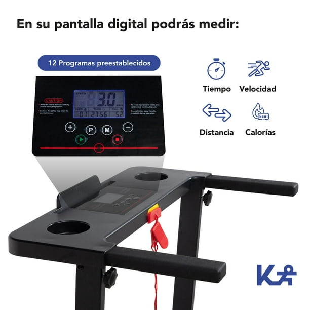 - Pantalla LED que indica tiempo, velocidad, distancia recorrida, calorías y programas. Potencia: 2 HP. Velocidad máxima de 10 km/h.