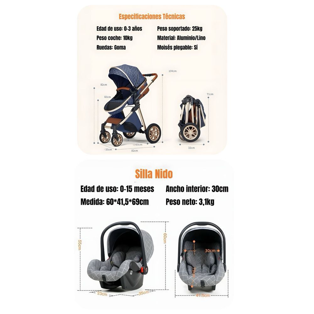 Color de este coche: NegroAdvertencia: La silla nido NO debe ser usada como silla de retención infantil, es exclusivamente para uso en el coche.Incluye estos accesorios: protector de lluvia, bolos multiuso, protector de asienteo, mosquitero y aislante de calor.Compuesto de materiales lujos de ultima tecnología, cuenta con un marco completamente reforzado, con un moisés de seguridad 3 en 1 con pantalla de seguridad incorporada en su toldo, la cual permite la wika vigilancia de su bebé y la circulación de aire.Es de tela de lino con doble algodón reforzado (al igual que su silla nido) el cual puede cambiar a multiples ángulos y ponerlo en posición frente a usted o en modo panorámico, para que su bebé pueda explorar el camino.Su manillar tiene una cubierta de Ecocuero, y un botón para plegado del coche con una sola mano.Sus ruedas son de goma reforzada resistentes a todo tipo de terreno con tecnología de amortiguación 3D.
