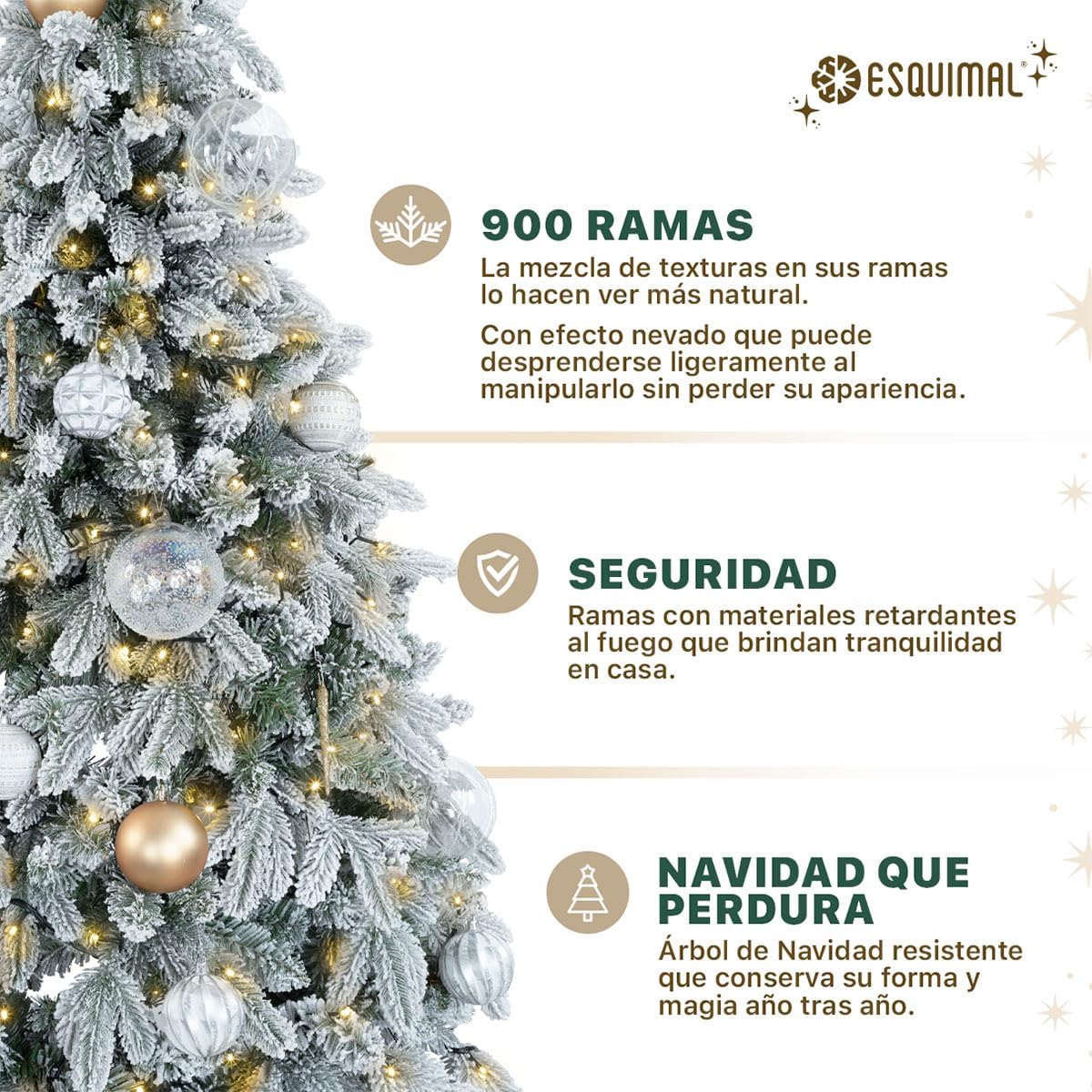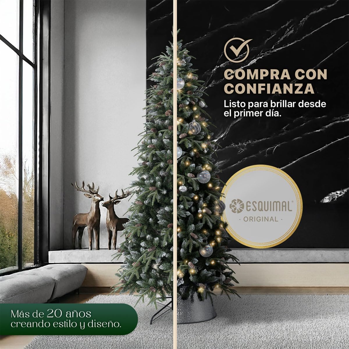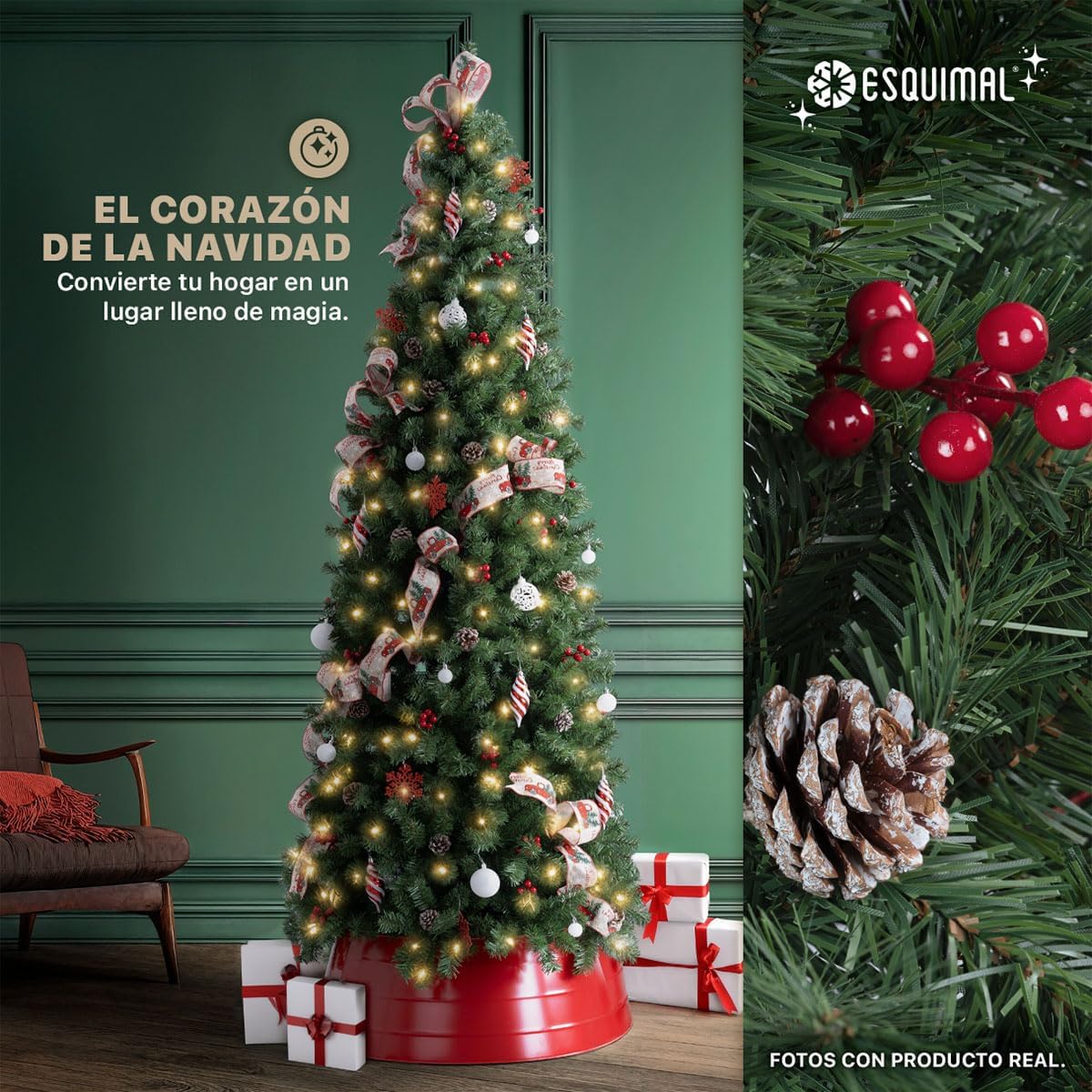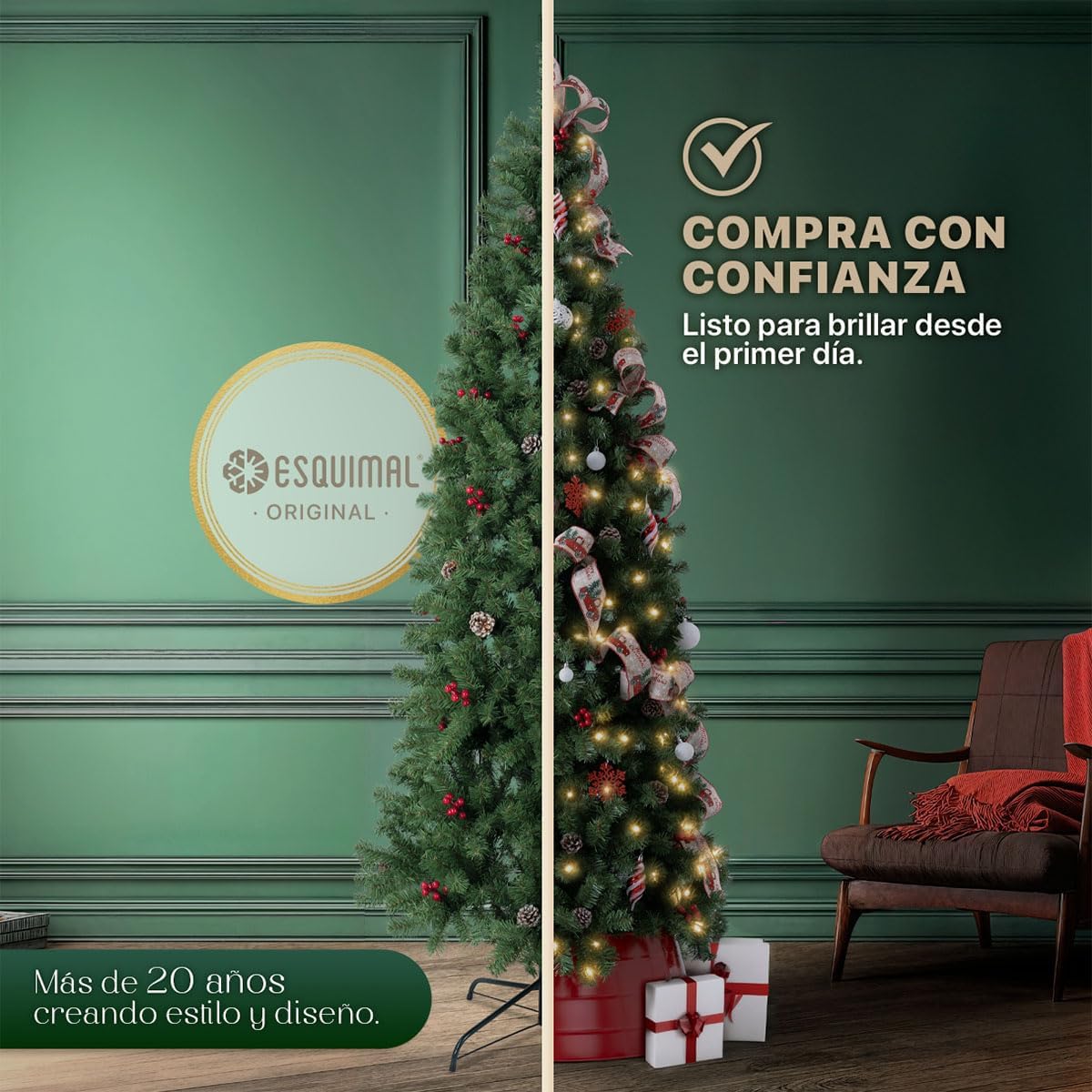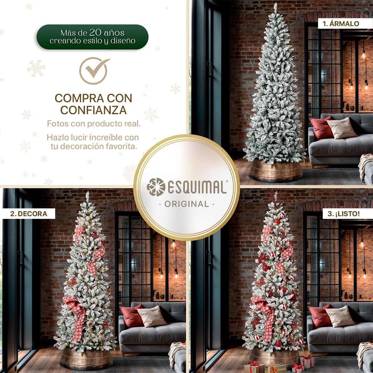 - DECORACIÓN INNOVADORA ESQUIMAL: Con más de 20 años de trayectoria y miles de familias satisfechas, Esquimal es referente de confianza para muchos hogares. Esta temporada invernal, nuestra colección de árboles y decoración navideña continúa acompañándote en la transformación de tus espacios con acabados mejorados y diseños únicos.